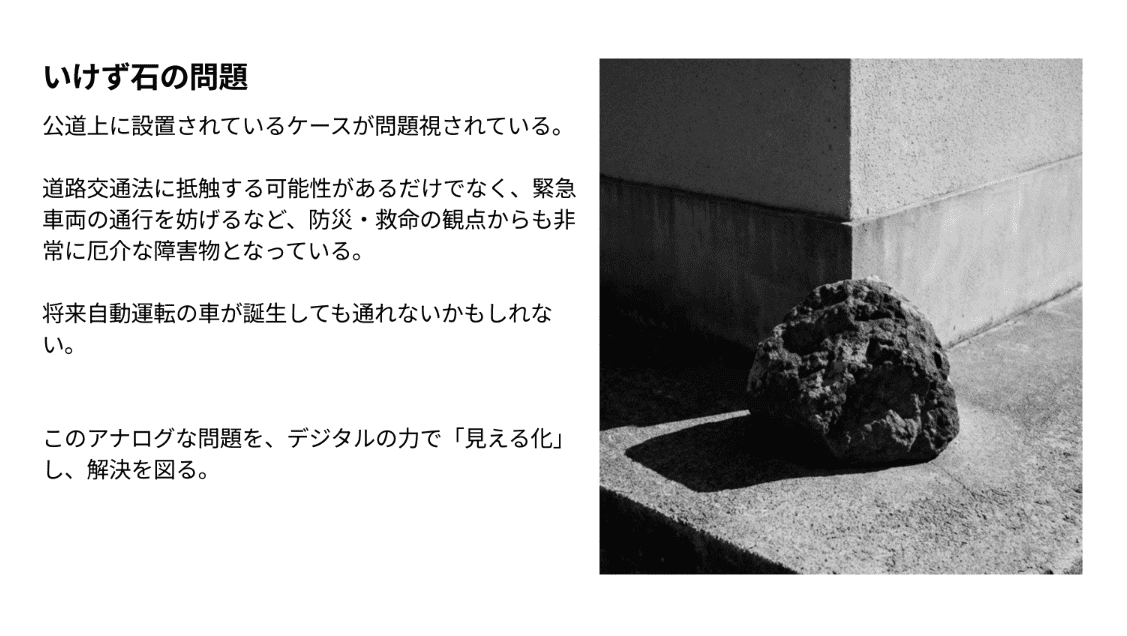 チーム「石」による本作が題材にしたのは、京都の路地で見かけることのある「いけず石」だ。敷地を車の衝突から守るため狭い路地や曲がり角に置かれる石だが、公道上に設置されているケースもあり、通行の妨げや緊急車両の通過を阻害する存在として、たびたび問題視されてきたという。