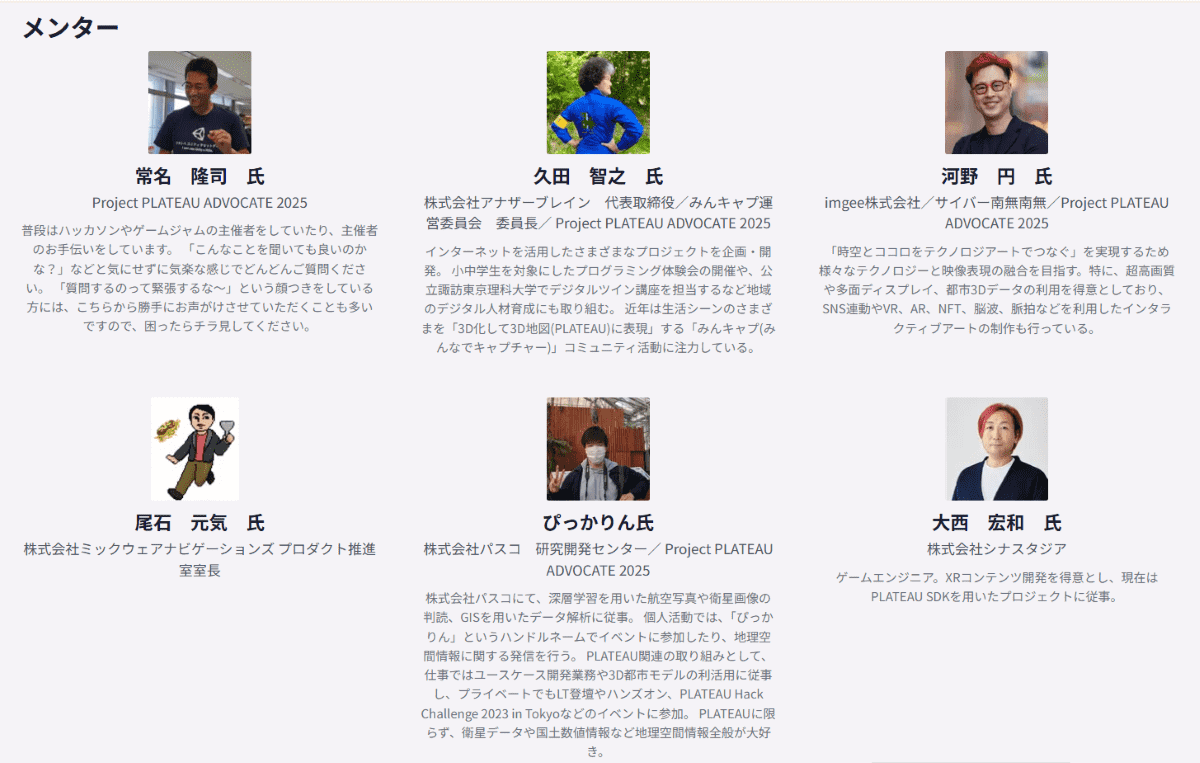 会場では、3D都市モデルや各種ツールに精通したメンター陣が常に目を配り、各チームのアイデア整理から技術的な壁の突破まで、伴走する形でサポートに当たった。メンターとして参加したのは、常名 隆司氏(Project PLATEAU ADVOCATE 2025)、久田 智之氏(株式会社アナザーブレイン 代表取締役/みんキャプ運営委員会 委員長/Project PLATEAU ADVOCATE 2025)、河野 円氏(imgee株式会社/サイバー南無南無/Project PLATEAU ADVOCATE 2025)、尾石 元気氏(株式会社ミックウェアナビゲーションズ プロダクト推進室 室長)、ぴっかりん氏(株式会社パスコ 研究開発センター/Project PLATEAU ADVOCATE 2025)、大西 宏和氏(株式会社シナスタジア)。