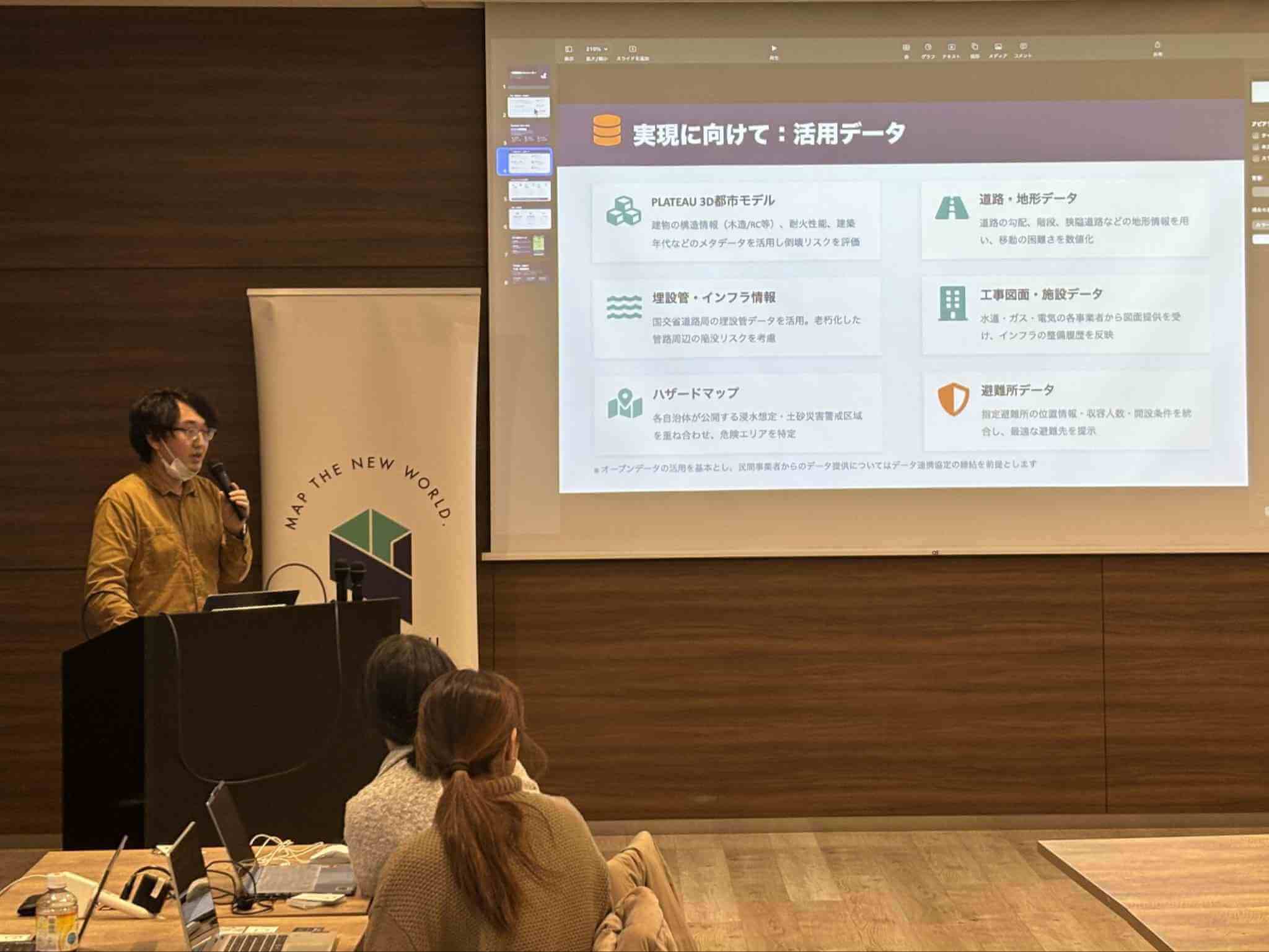 「今回は防災にフォーカスしてアイデアを出していただきましたが、『今あるマップなどの情報では足りない』という問題意識が共有できたこと自体が大きなステップだと感じました。個人の状況や場所の特性に対応できるのがデータのポテンシャルです。PLATEAUは3Dにこだわる必要はなく、ほかのデータと連携しながら可視化やアプリ構築につなげられるところが強みです。今回の発表では、その具体的な可能性が見えてきたように思います」(国土交通省 十川氏)