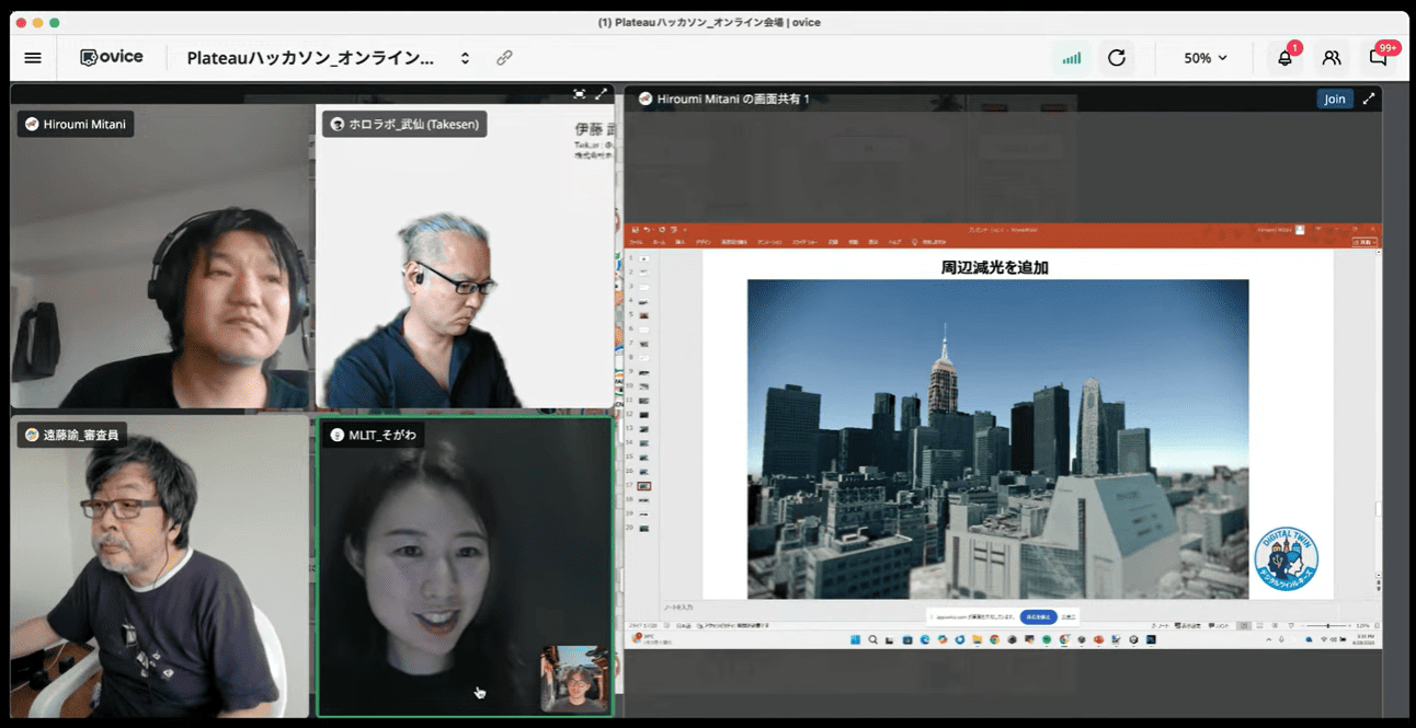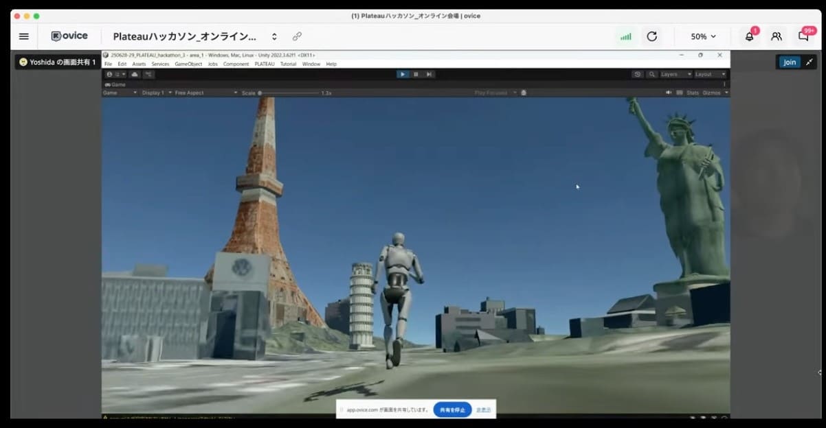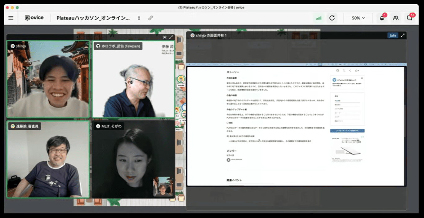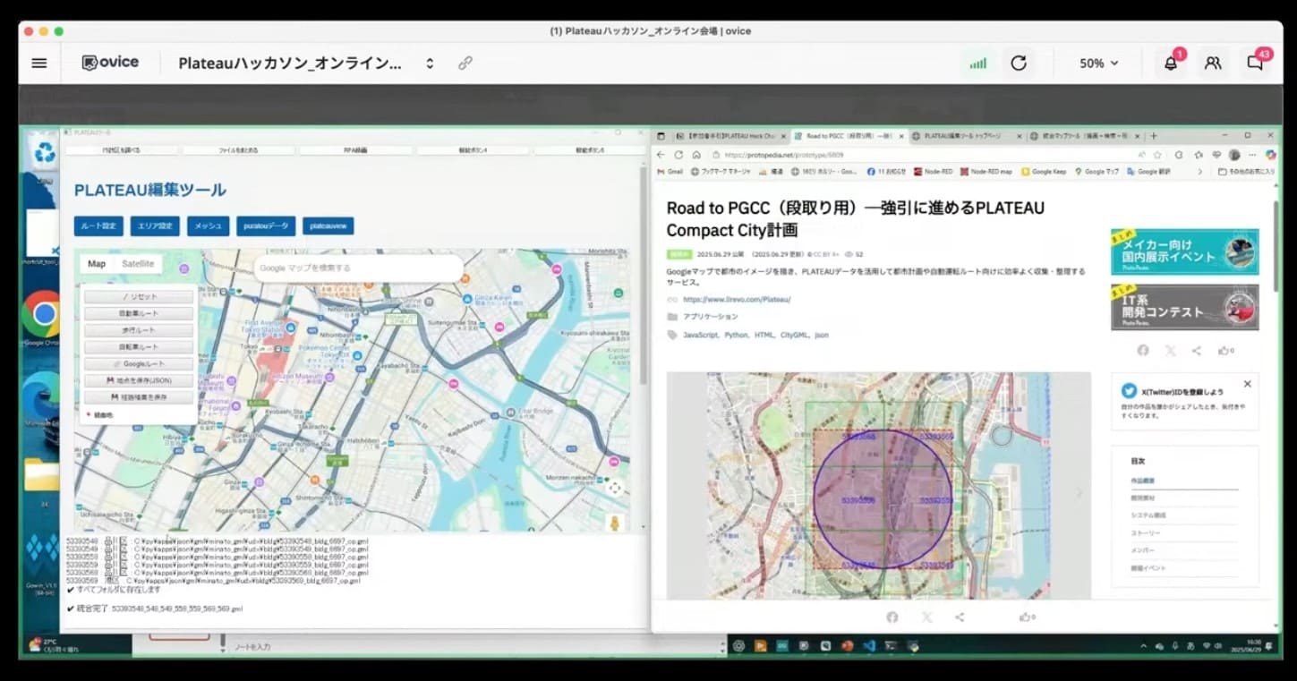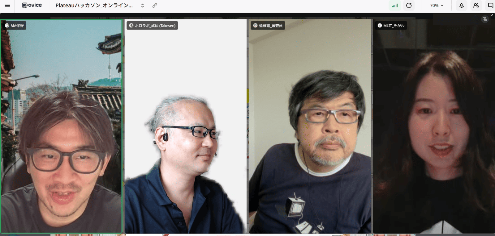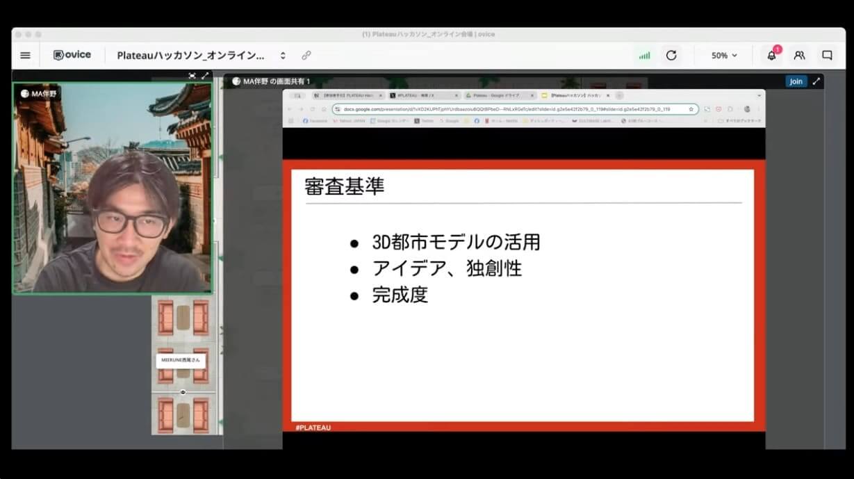 PLATEAU NEXT 2025の取り組みの一環として、3D都市モデル「PLATEAU」の社会実装を促すイベントのひとつ「PLATEAU Hack Challenge for ルーキー」が、2025年6月28、29日にバーチャルスペース「oVice」を使ってオンライン開催された。PLATEAU初心者に向けたハッカソンだ。2日間にわたるプログラムを終えて最終プレゼンを行った8チームのうち、多くが1名参加による単独チームとなった。AIを使った個人での開発の可能性を示す一方、初対面同士でチームビルディングを行い、作品をつくりあげたルーキーチームの活躍も光った。