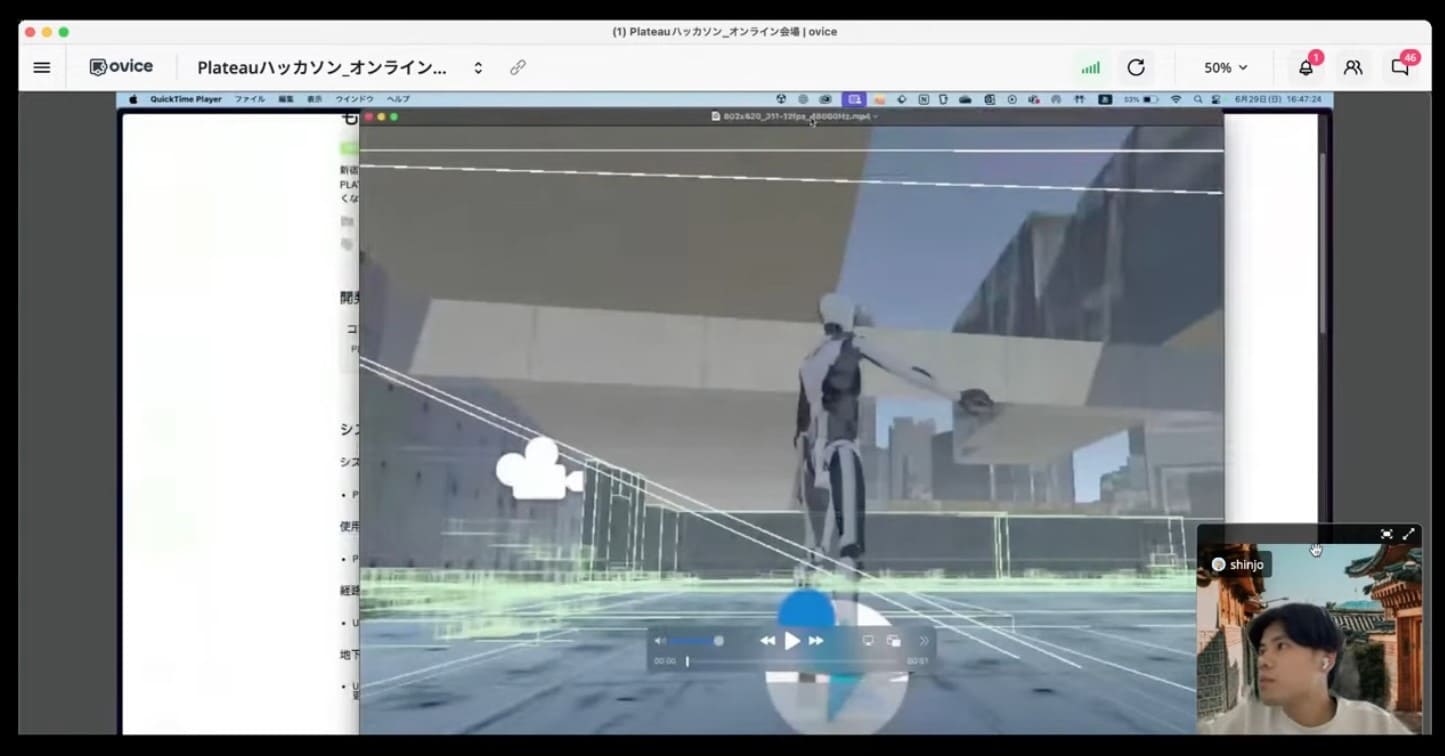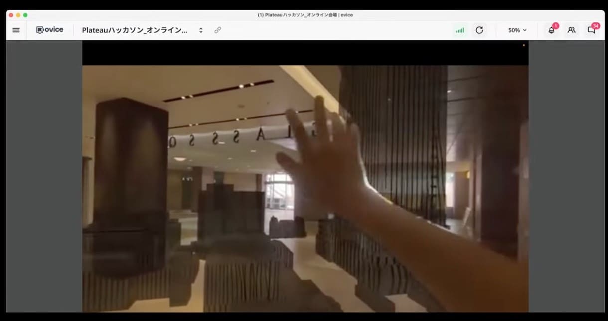 チーム「じぇつ」も1名単独チーム。3D都市モデルとヘッドマウントディスプレイ(Apple Vision Pro)を連携させ、ユーザーの挙動をリアルタイムで3D空間内に反映させるシステムの構築に挑戦した。映像を生成するTouchDesigner、それを受信するUnity、これらを重ね合わせるApple Vision Proといった複数のツールや技術を連携したアイデアがユニーク。ただ今回は時間の制限もあり、Apple Vision ProのEnterprise APIの利用が難しかったため、iPhoneで撮影してデモンストレーションしたという。