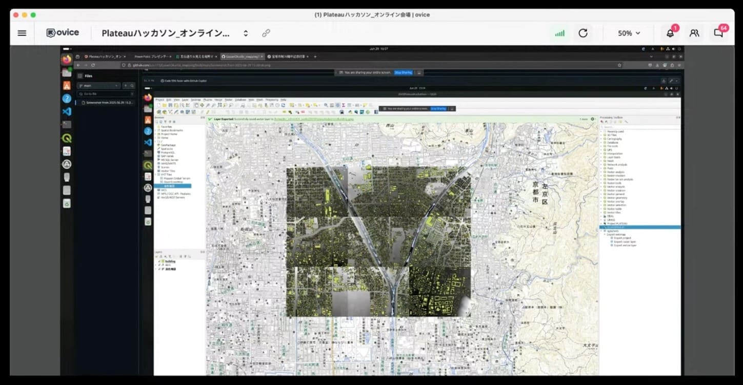 当初は、UnityとPLATEAU SDK for Unityを使って建築物の屋上を飛び石のようにしてゴールを目指す「飛び石レースゲーム」を開発予定だったが、PCスペックが十分ではなく、やむなく断念。そこで、QGISを使って京都の「五山送り火」の可視領域をマッピングするプロジェクトに変更。今回、はじめてハッカソンに参加してみての感想として、「簡単そうなタスクでも、実行にはものすごい計算力が必要でなかなかできない」という、開発の魅力を実感したという。