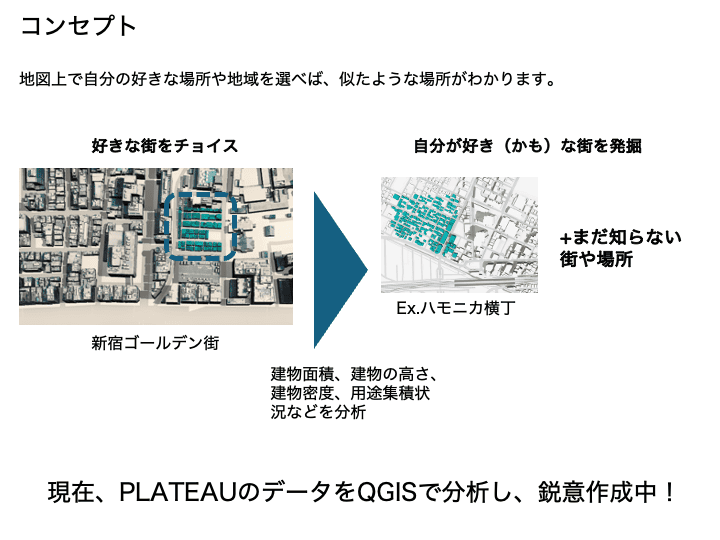 1名単独チームとして参加の「イズミ」氏が発表したのは、3D都市モデルの属性情報を用いて街の特性を数値化し、それに基づいて「自分が好きそうな場所」を探し出そうというアイデア。建物の面積や高さなどのデータをQGISにインポートし、分析する方法に取り組んだ。例えば、飲み歩きが好きな人が、新宿ゴールデン街の街としての特徴を割り出し、その基準に「似た雰囲気の飲み屋街」を探すことができる。「まだまだ精度が高くないので、建物の用途や密度、道路幅などの属性情報を加えてブラッシュアップしたい」と語った。