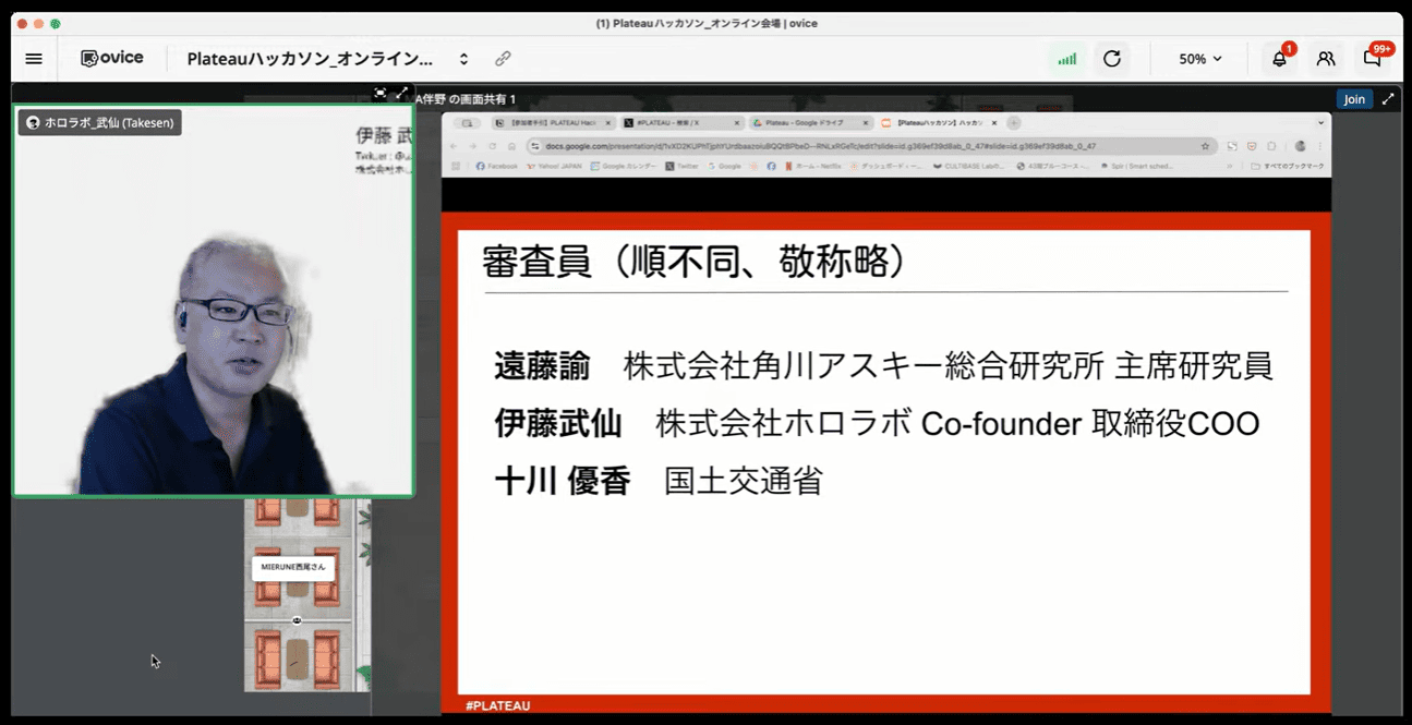 審査員は、伊藤武仙氏(株式会社ホロラボ Co-founder 取締役COO)、遠藤諭氏(株式会社角川アスキー総合研究所 主席研究員)、十川優香氏(国土交通省 都市局 国際・デジタル政策課 企画専門官)の3名。成果発表のプレゼン前に審査員が参加者へ激励の言葉を述べた。