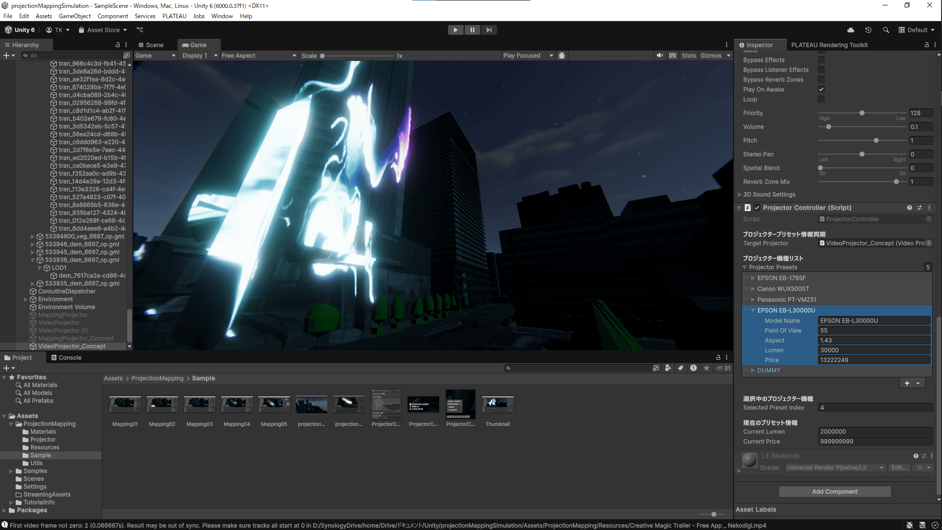 PLATEAU SDK for UnityとRenderingToolkitと連携し、3D都市モデルに昼・夕・夜の街の明るさを踏まえた投影状況を実現。投影方法としては、カスタムシェーダーで投影行列(Matrix VP)を受け取り、空間の位置に基づいたUV投影を行っている。機材の型番と設営コストを紐付け、概算シミュレーションまでを可能に。例えば「3200ルーメンのプロジェクターと3万ルーメンのプロジェクターでどれだけ映り方が違うか」を比較できるうえ、現場に必要なプロジェクター台数がわかり、コスト試算が容易になる。