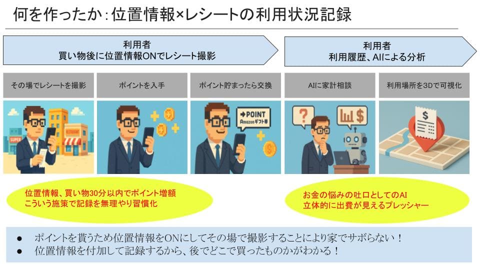 「レシート×位置情報×ポイント×3D都市モデル」を統合したプラットフォームのアイデアがユニークだ。メインクラウドはAWS、レシート解析にはAzure AI Document Intelligenceを採用するなど、複数のクラウドサービスを活用。3Dマップの可視化にはCesium ionを利用し、マップ上に自分の購買履歴を光る軌跡として見せる演出もしている。