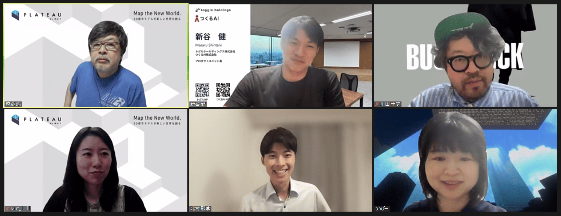 パネリストとして、グランプリを受賞したつくるAI株式会社の新谷健氏、エモーション賞を受賞したうっぴー氏、ファイナリストの北村駿季氏(パシフィックコンサルタンツ株式会社)。さらに、「PLATEAU AWARD 2024」でも審査委員を務めた川田十夢氏、国土交通省の十川優香氏、司会を務める角川アスキー総合研究所の遠藤諭氏が参加し、それぞれの視点から議論を深めた。