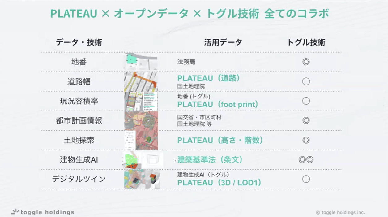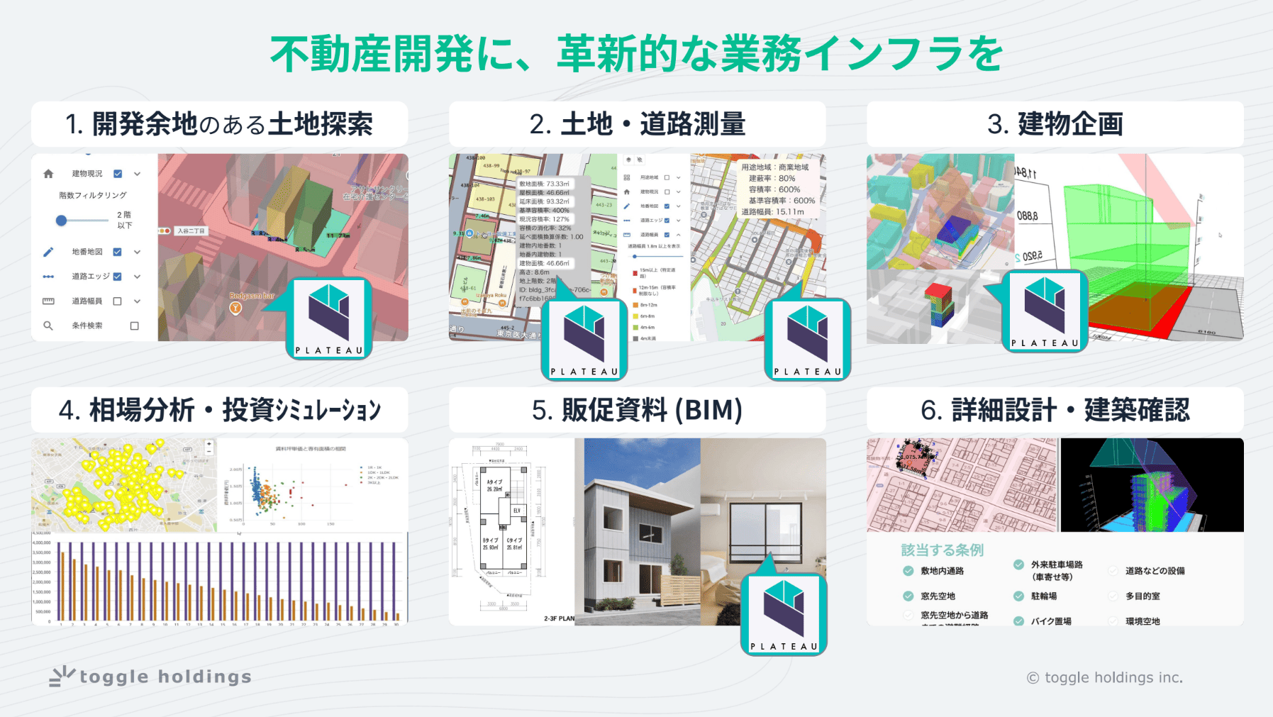 不動産開発では、土地の探索、測量、建物企画、相場分析、販促資料の作成、詳細設計など工事に着手するまでに多くの工程があり、数カ月を要するケースも少なくない。同社は、PLATEAUをはじめとして各種オープンデータや生成AI、独自の解析技術を組み合わせ、これらの業務を効率化するデジタルインフラを構築している。