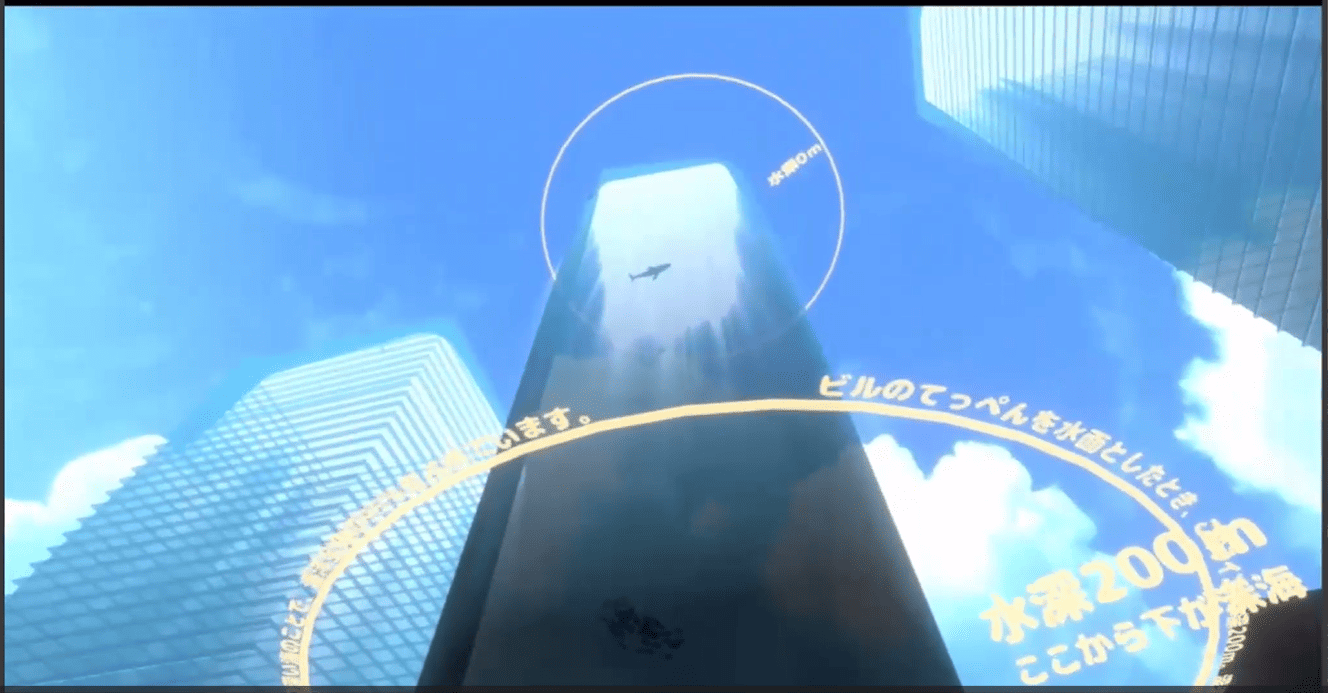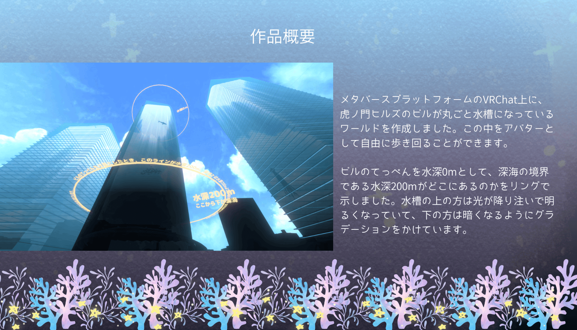 「PLATEAU AWARD 2024」でエモーション賞を受賞したうっぴー氏の「虎ノ門深海水族館」は、虎ノ門ヒルズのビルを水槽に見立て、深海のスケールを感じられるメタバース作品だ。