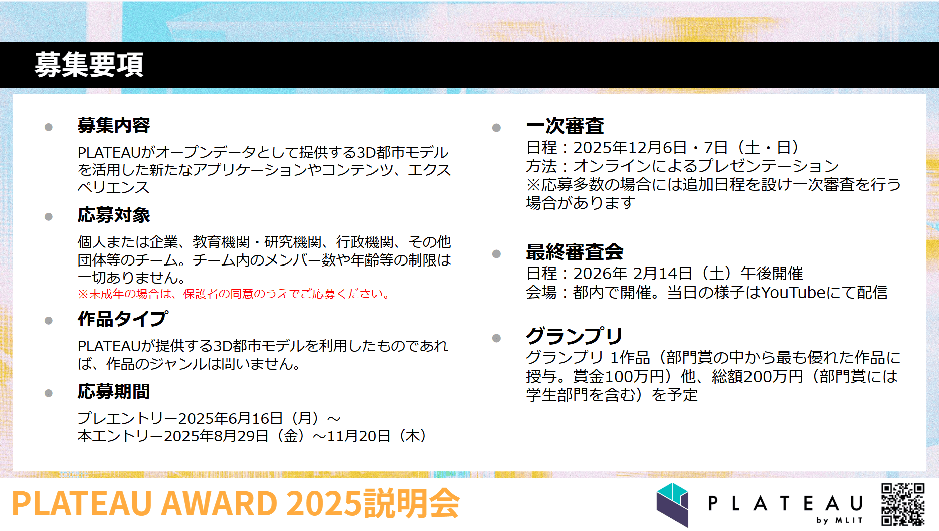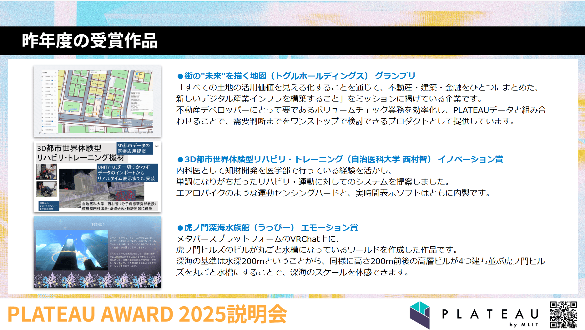 2024年度は10代から70代まで幅広い層が参加し、特に20代の学生からの応募が多かった。受賞作品は「PLATEAU AWARD 2025」特設ページにて、受賞者のコメントや発表資料、最終審査会・表彰式のアーカイブ映像とともに公開されている。