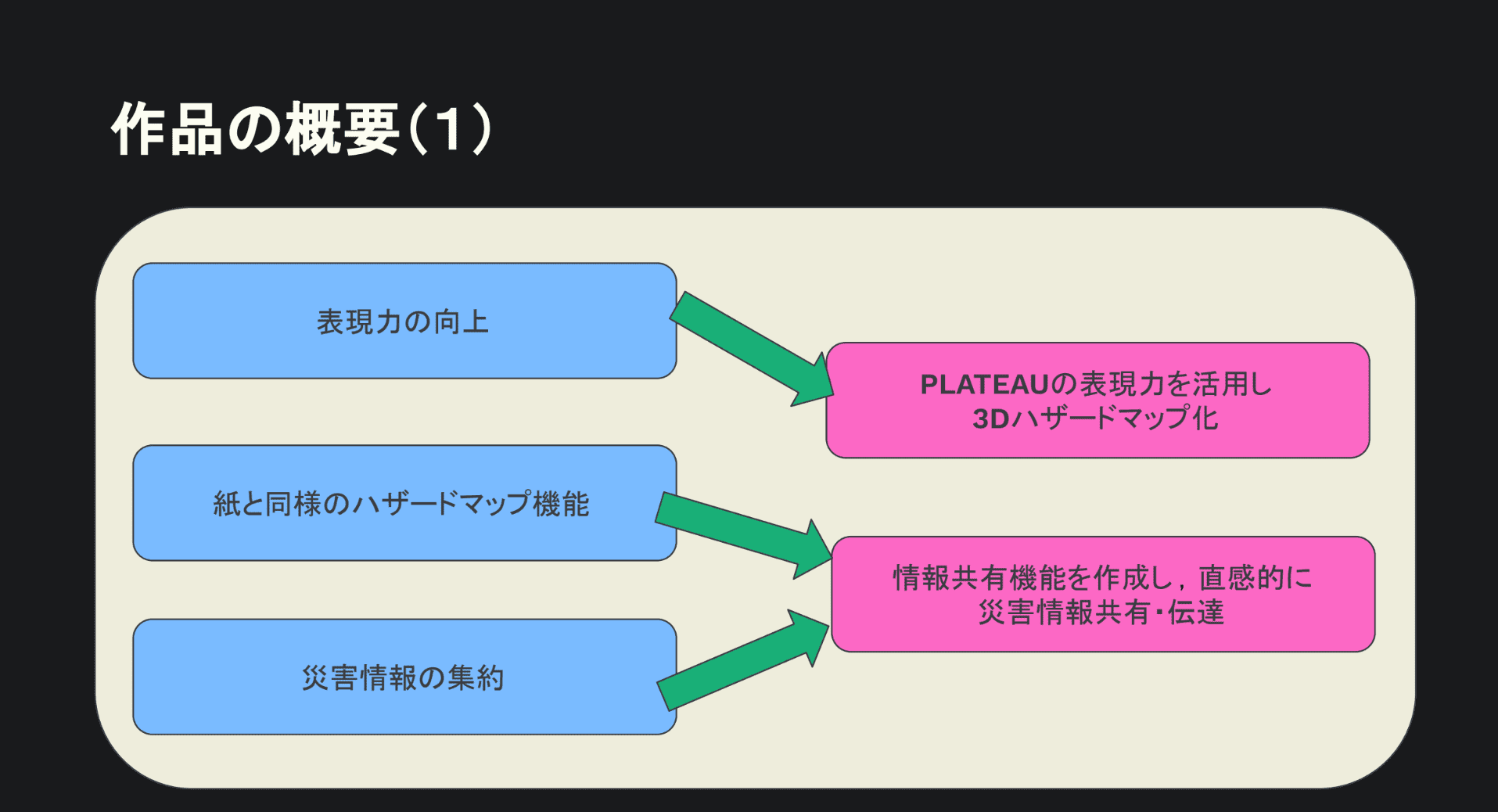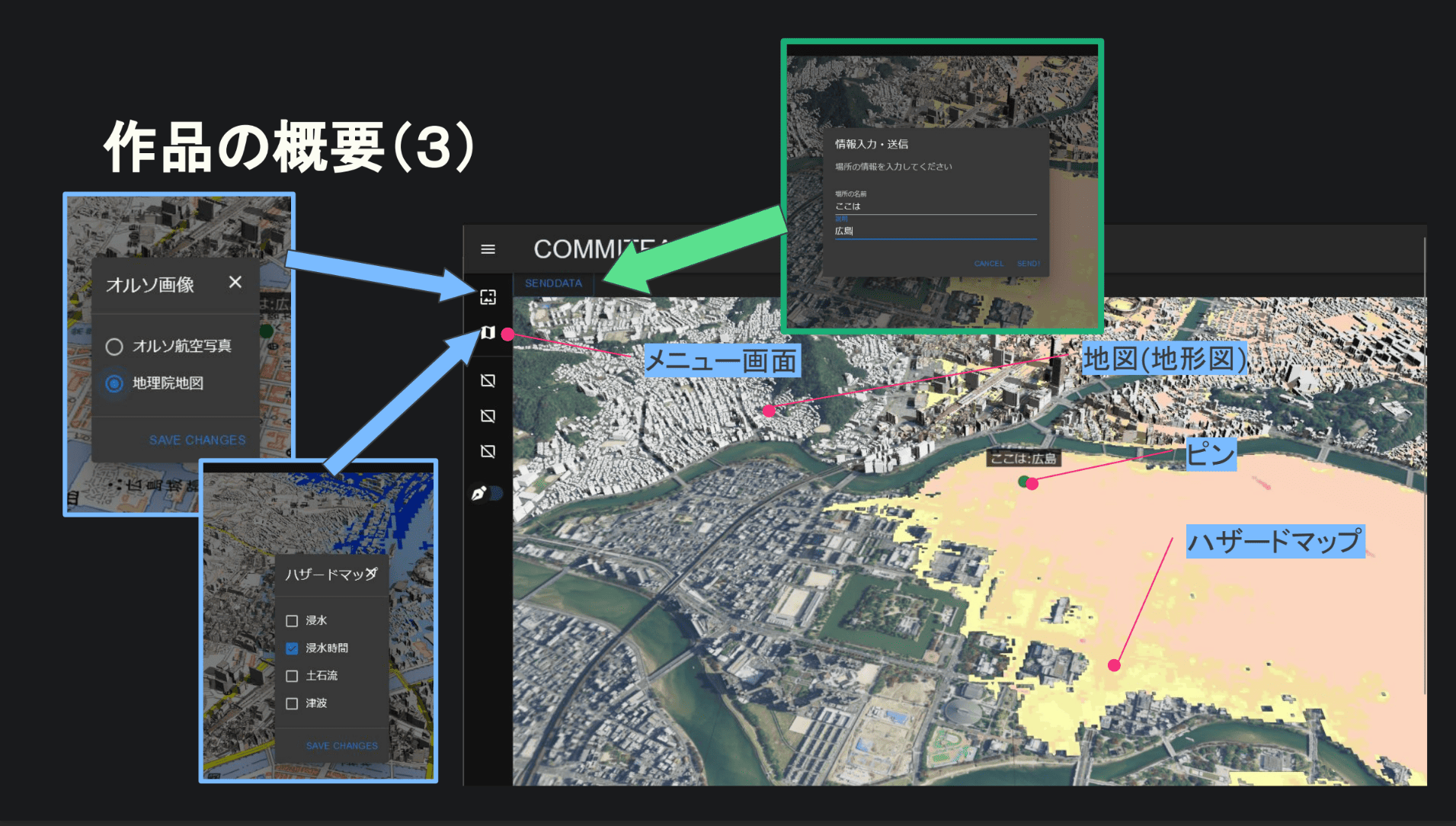 広島高校情報部の作品は、「PLATEAUを利用したコミュニケーション、情報共有ツール」。既存のハザードマップでは視覚的に伝わりにくい災害のリスクを、PLATEAUの地形データと重ねて3Dにし、直感的に理解できるようにした。地域課題に根ざしたテーマ設定が評価され、純粋な関心からPLATEAUに触れてくれたことが審査委員の心を打ったという。