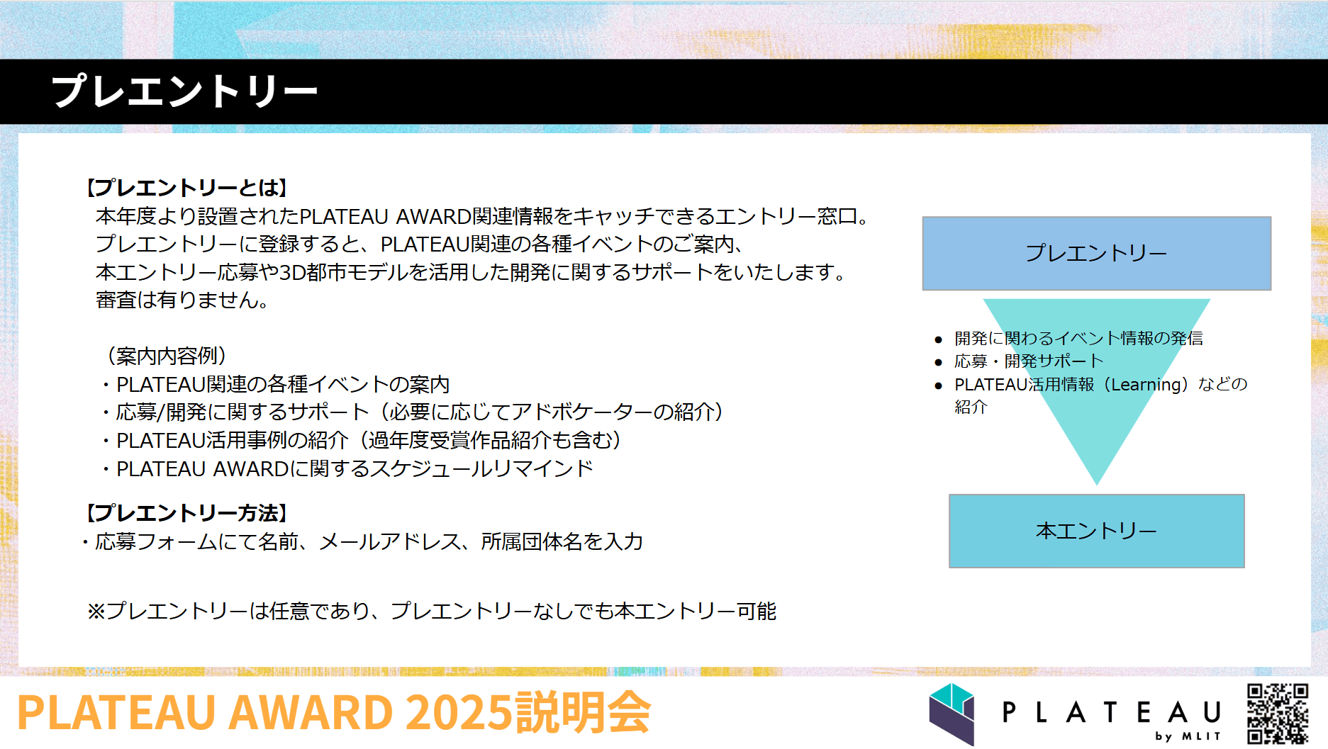 応募は、所定フォームから必要事項を入力し、プレゼン資料と作品の動作が確認できるYouTube動画(限定公開)を提出する形式。なお、プレエントリーに登録すると、PLATEAU AWARDや関連イベントの情報が届くほか、PLATEAU AWARDへの応募のサポートなどを受けられる。本エントリーを検討している方は、まずプレエントリーに気軽に登録してほしい。