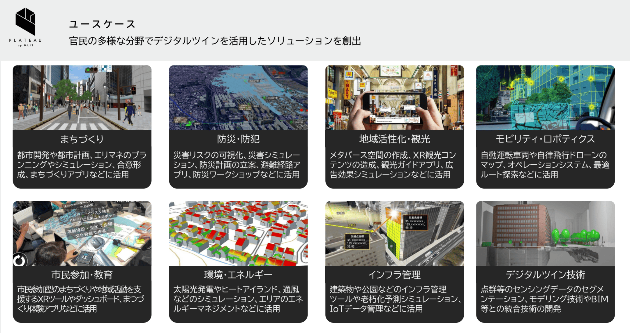 Project PLATEAUは、国土交通省が2020年に始めた都市のデジタルツイン構築プロジェクト。自治体が保有する都市計画図などの既存リソースや航空測量の情報を活用し、建築物や道路などの3D都市モデルを整備・公開することで、都市の課題解決やまちづくりのDXを支援している。