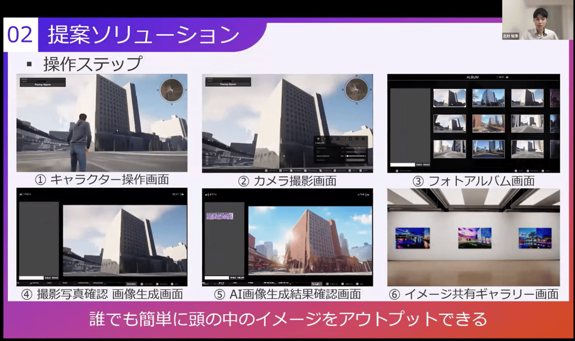 「PLATEAU AWARD 2024」ファイナリストの北村駿季氏が発表したのは、「イメージ共有ツール Vision×Link」。まちづくりや建物の建設において自分が思い描くイメージを他者と共有しようとするときに、ゲーム空間上で任意の建物を撮影し、画像生成AIと連携することで、新たな街並みや建物のイメージを手軽に具体化し、共有するツールだ。「PLATEAU AWARD 2024」では、建築や都市設計におけるイメージ共有を誰でも直感的に行える点が評価された。