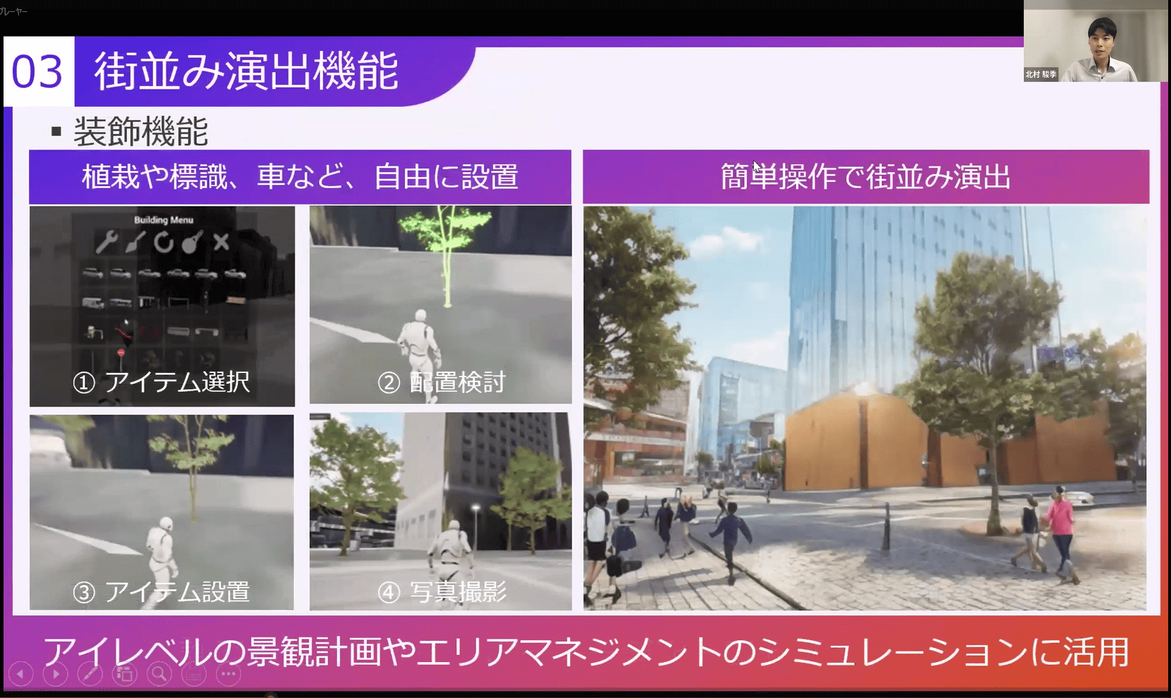 PLATEAU AWARDに挑戦して得られたことについて、北村氏は「AWARDをきっかけにツールの開発に取り組んで、実務的にも個人的にも得るものがあった。実務においては、従来だと建物のイメージ作成に時間もコストがかかっていたが、このツールで気軽に多様なものを試作できるようになった。そして個人的には、AWARDに向けた取り組みを通じて転職活動がうまくいった」と笑顔を見せた。