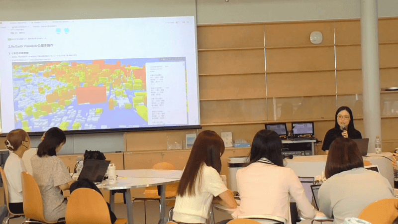1日目は、PLATEAUの概要やユースケース(活用事例)の紹介、「Figma」や「Re:Earth」といったツールのレクチャーなどが行われた。講師は国土交通省の宮崎優氏、アクセンチュア株式会社の三上真穂氏、株式会社cencoの岡部千幸氏、株式会社Eukaryaの吉岡さくら氏が務めた。
