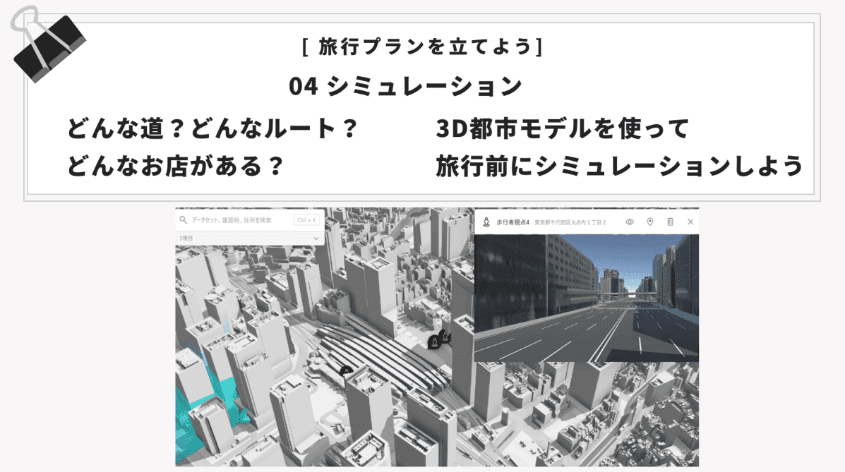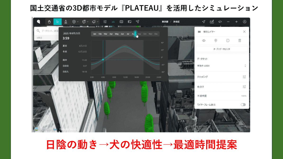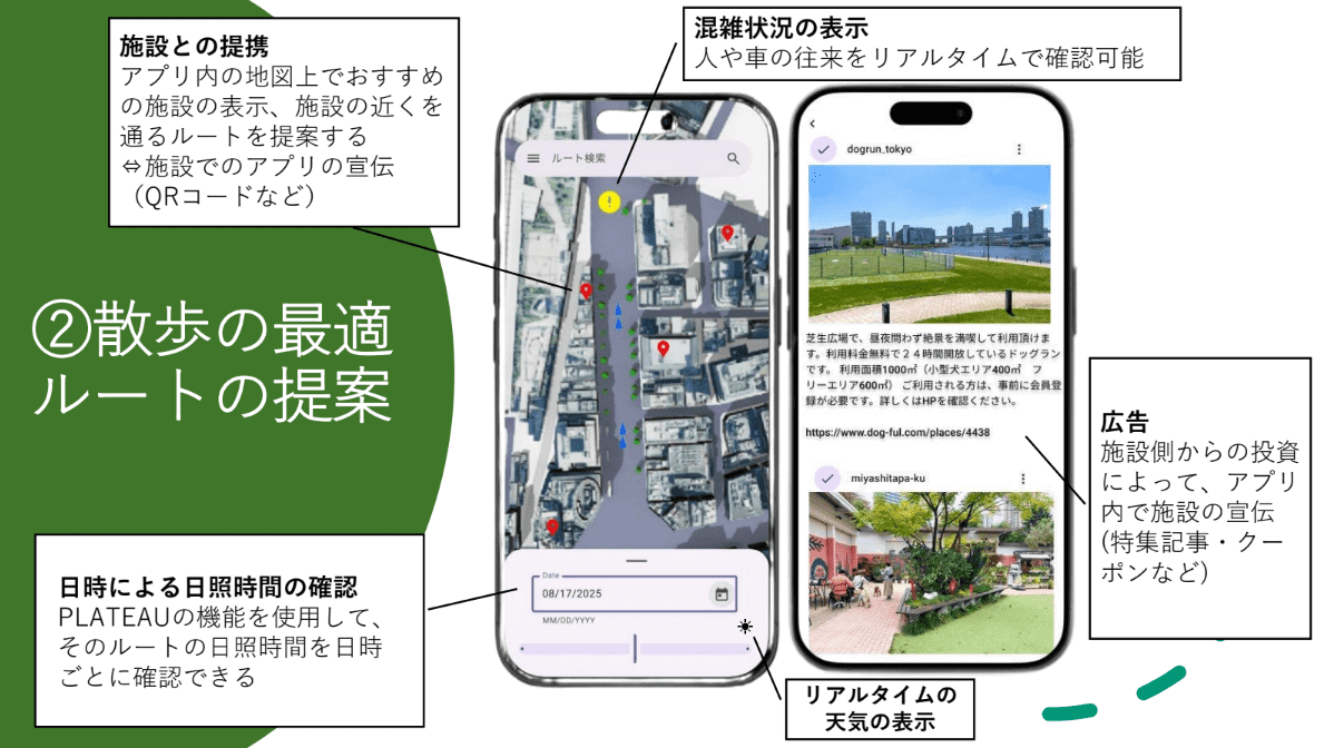 アプリでは、バリアフリー優先や屋根のある道を選択できる詳細設定を用意。さらに地図上で経路をなぞることで「日陰を通りたい」「寄り道したい」といった個別のニーズにも対応できる。検索後にはPLATEAUの3D都市モデルを活用し、設定したルートを実際に歩いているかのような動画を生成。時間帯を指定して日照の変化を再現できる機能も備えており、利用者は立体的な都市空間の中で移動イメージを直感的に掴むことができる。