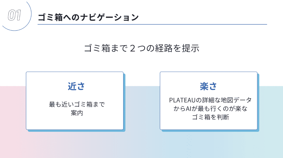 アプリの機能は大きく3つ。1つ目は「ゴミ箱ナビゲーション」。現在地から最短ルートと、バリアフリーや移動のしやすさを考慮した「楽なルート」の2種類を提示する。PLATEAUの詳細なデータを活用し、利用者が快適にゴミ箱にたどり着けるよう工夫した。