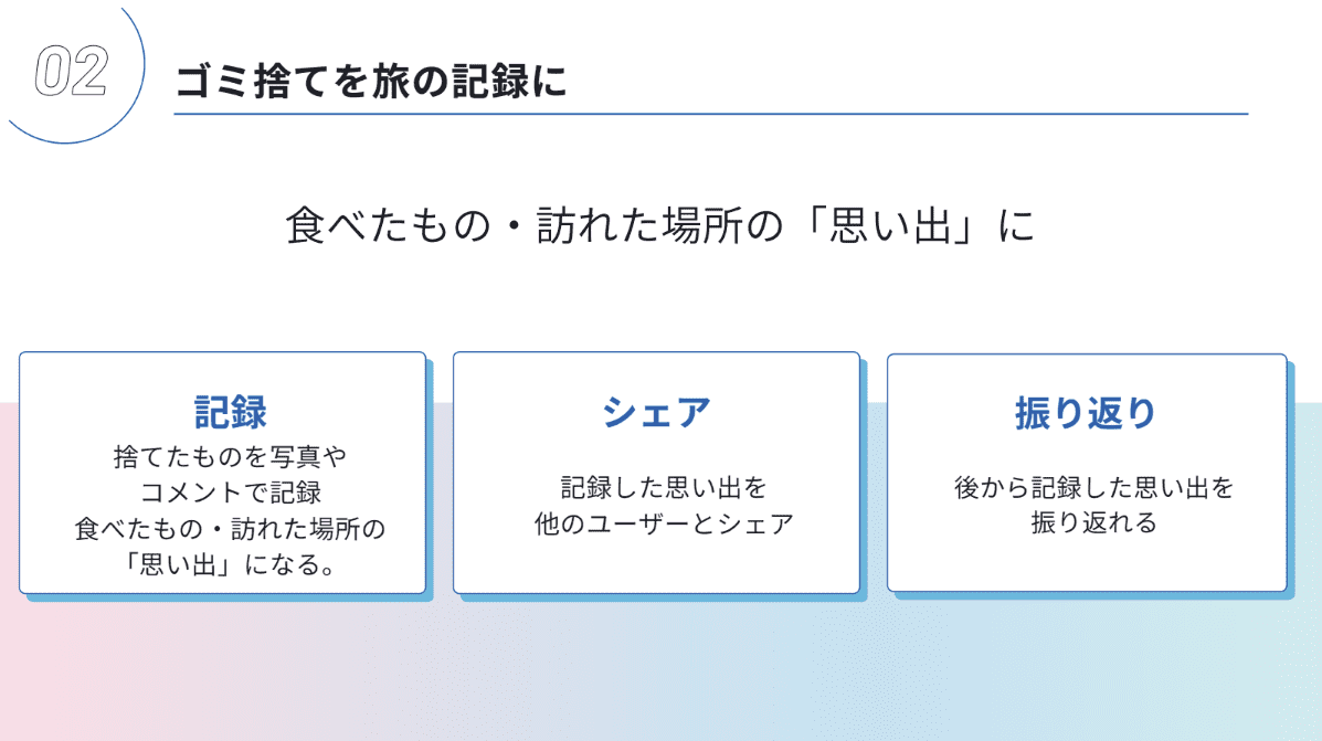 2つ目は「旅の記録機能」。ゴミ箱に貼られたQRコードを読み取ることで、訪れた場所や食べたものを記録でき、旅の思い出とゴミ捨ての体験をつなげる仕組みである。3つ目は「スタンプラリー機能」。ゴミを捨てるたびにスタンプが貯まり、楽しみながらゴミ捨てを習慣化できる。さらに、IoTスマートゴミ箱の導入も提案し、容量の把握や圧縮機能による効率的な回収管理を想定した。