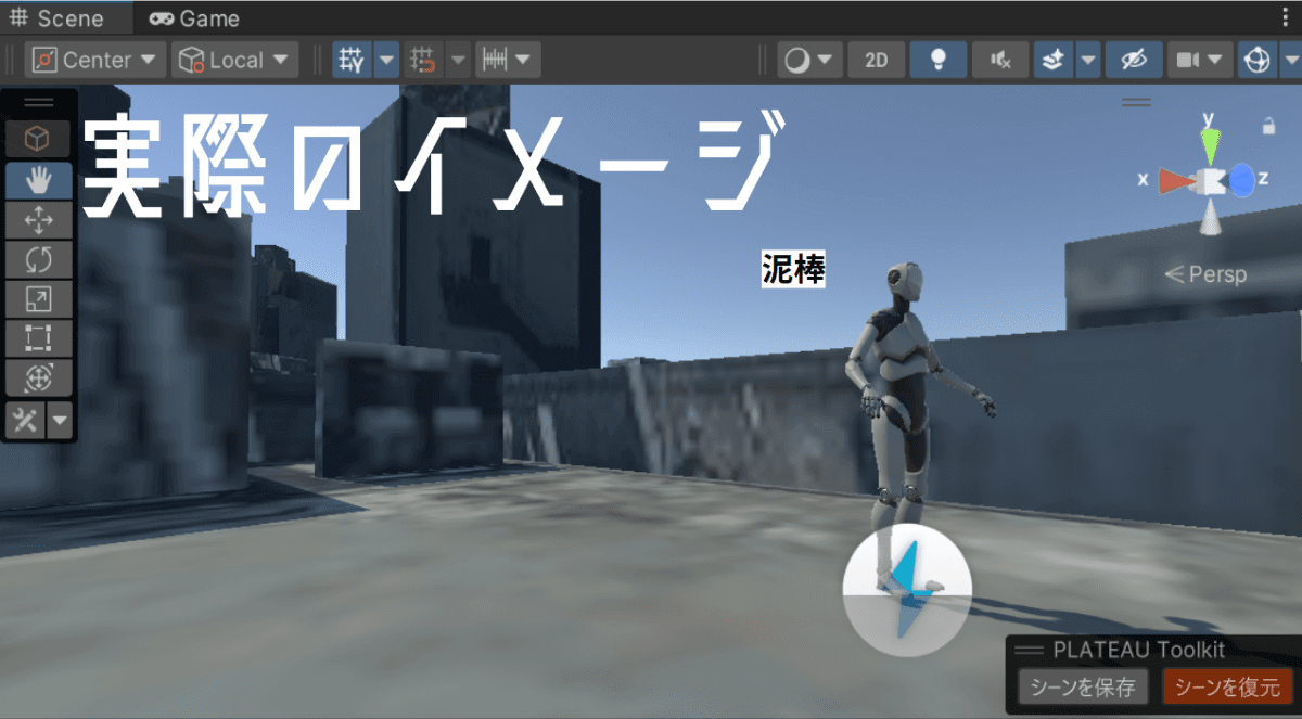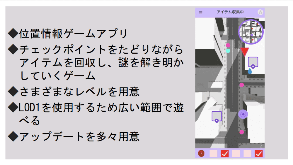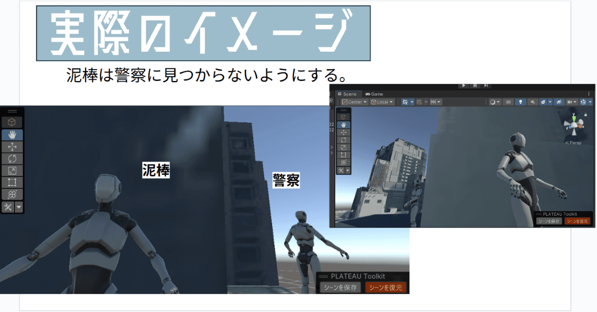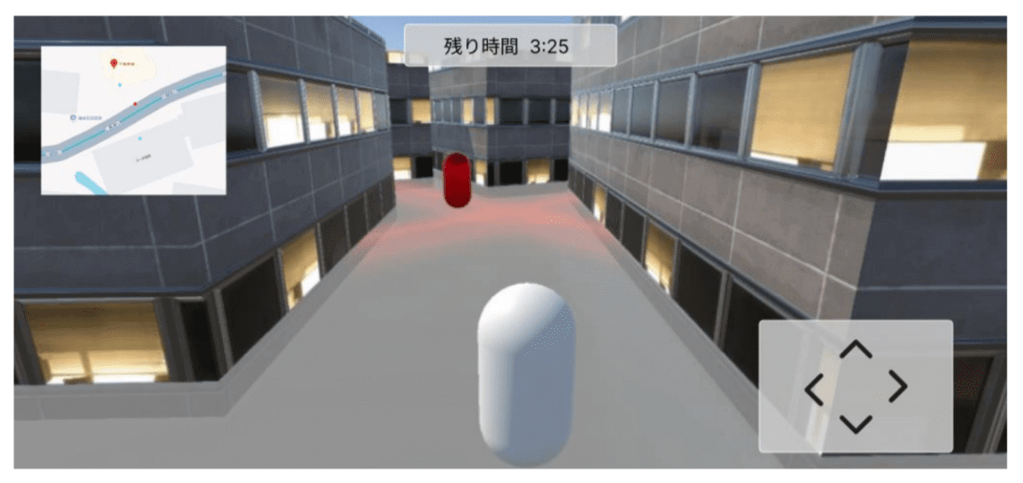 審査員特別賞を受賞したのは、スクエアKチームの「ドキドキ♡リアルドロケイ」。PLATEAUの3D都市モデル(LOD2)を用いて、渋谷の街を舞台にした3人称視点のゲームを開発。プレイヤーは「泥棒」となり、警察の視界に入らないように建物の影に隠れながら逃走する。つまり、警察をどこに、何人配置するかによって難易度が変わる。