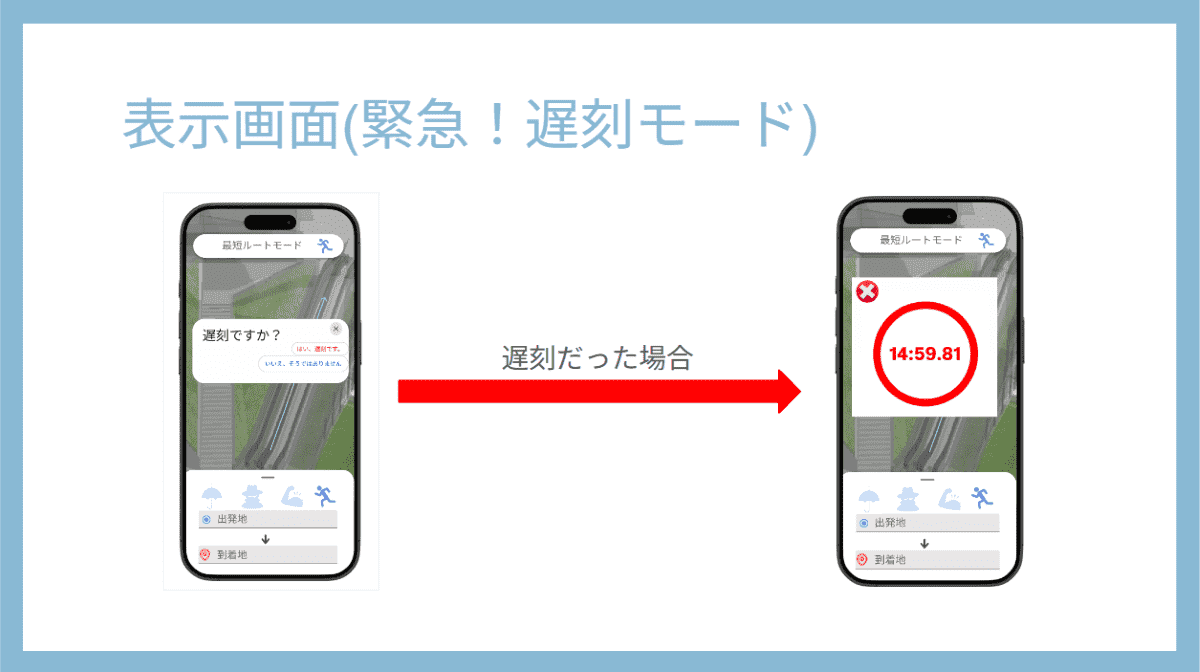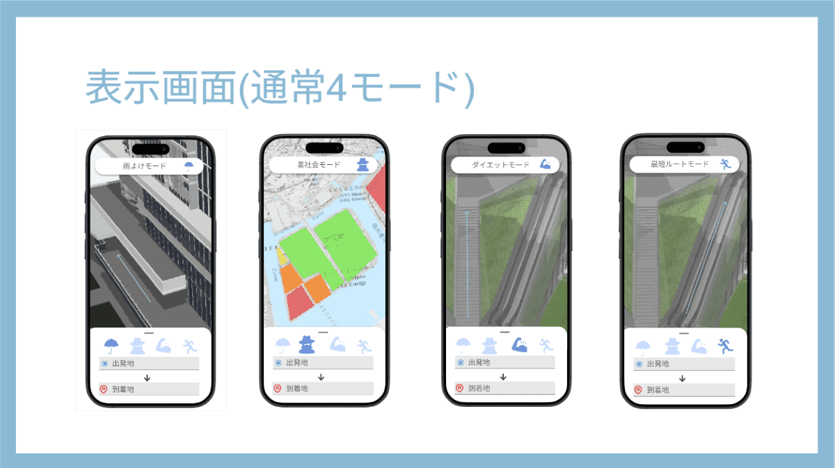 さらに、「ダイエットモード」では坂道や階段をあえて含む経路を提示し、運動量を増やせるように設計。「最短ルートモード」ではエスカレーターや近道を優先し、遅刻しそうな際にはカウントダウン機能付きの「緊急!遅刻モード」が作動する。将来的には、大雨時の浸水リスク表示や地下街・交通情報との連携も視野に入れ、安全性と利便性を高めていきたいとした。