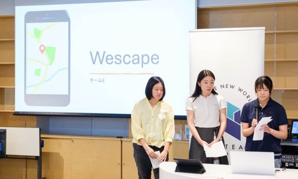Eチームは、観光地の混雑緩和を目的とした街歩きゲームアプリ「Wescape」を提案。大型連休などで観光地のメインストリートや電車が混雑し、裏道や周辺店舗が活用されない課題を踏まえ、観光客を自然に裏道へ誘導する仕組みを構想した。