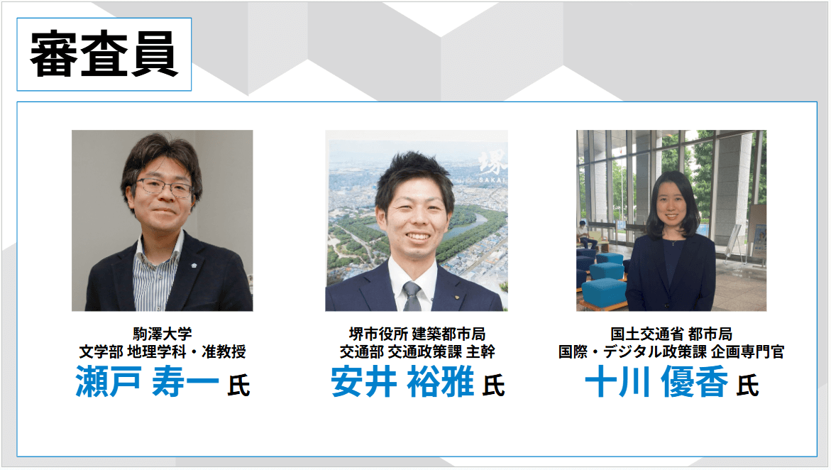 成果発表会には、10チームが参加。審査は、3D都市モデルの活用度、アイデアの独創性、地域課題への貢献度の3基準で行われた。審査員は、駒澤大学 文学部 地理学科 准教授の瀬戸寿一氏、堺市役所 建築都市局 交通部 交通政策課 主幹の安井裕雅氏、国土交通省 都市局 国際・デジタル政策課 企画専門官の十川優香氏の3名で審査が行われた。どのような作品が誕生したのか見ていこう。