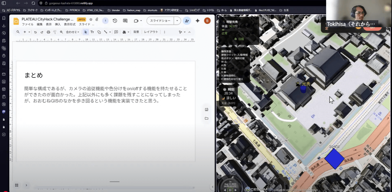 PLATEAUを活用し、京都の3D都市モデルをCesium上で表示し、建物内の移動や景観の変化を表現。日陰の表示は今回実装できなかったものの、その必要性を認識しているとのこと。