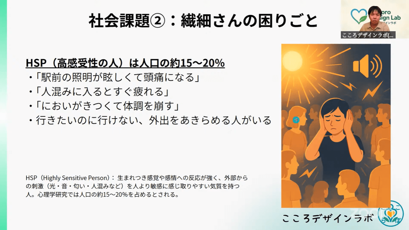 京都市の京都駅前広場の再開発における課題や、都市の移動における「効率優先」からの脱却、特にHSP(Highly Sensitive Person)のような感覚過敏な人々の疲弊に着目したアプリケーションを制作。光、音、匂い、混雑度、温度といった五感に関する「感情」を地図上に投稿・共有することで、利用者の特性に合わせた「心地よさ」を基準としたルート検索を可能にするプラットフォームを目指したとのこと。