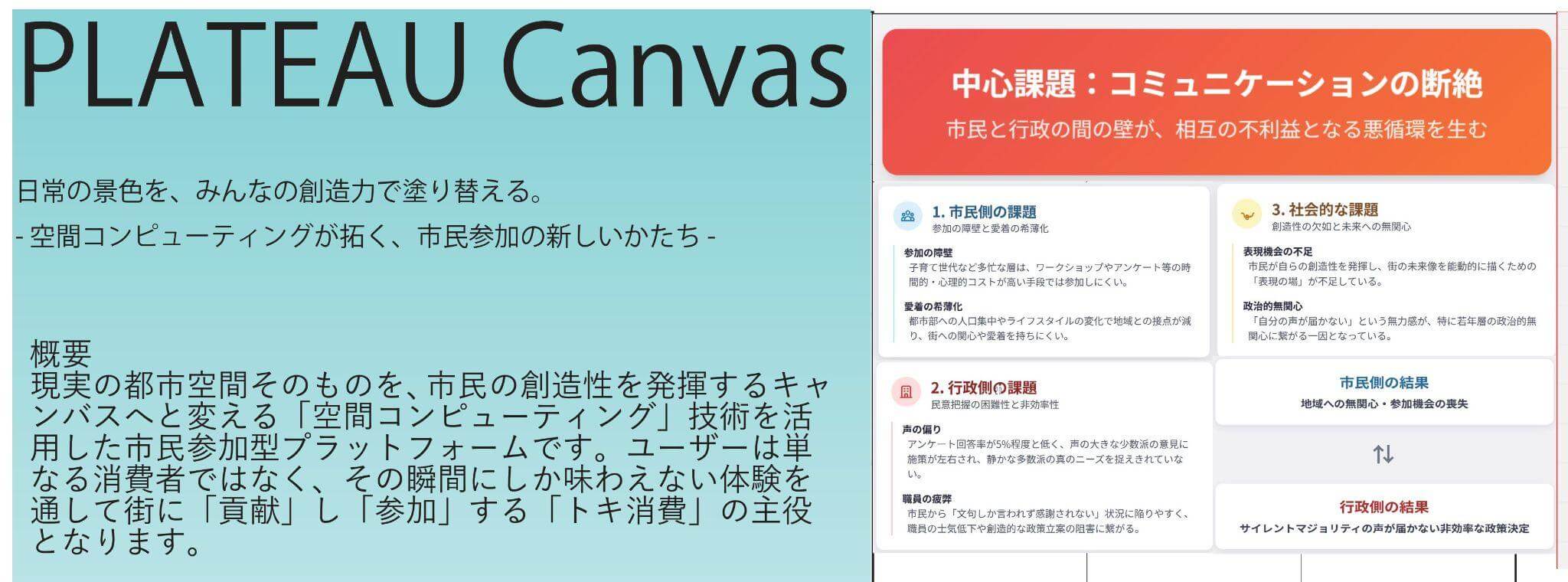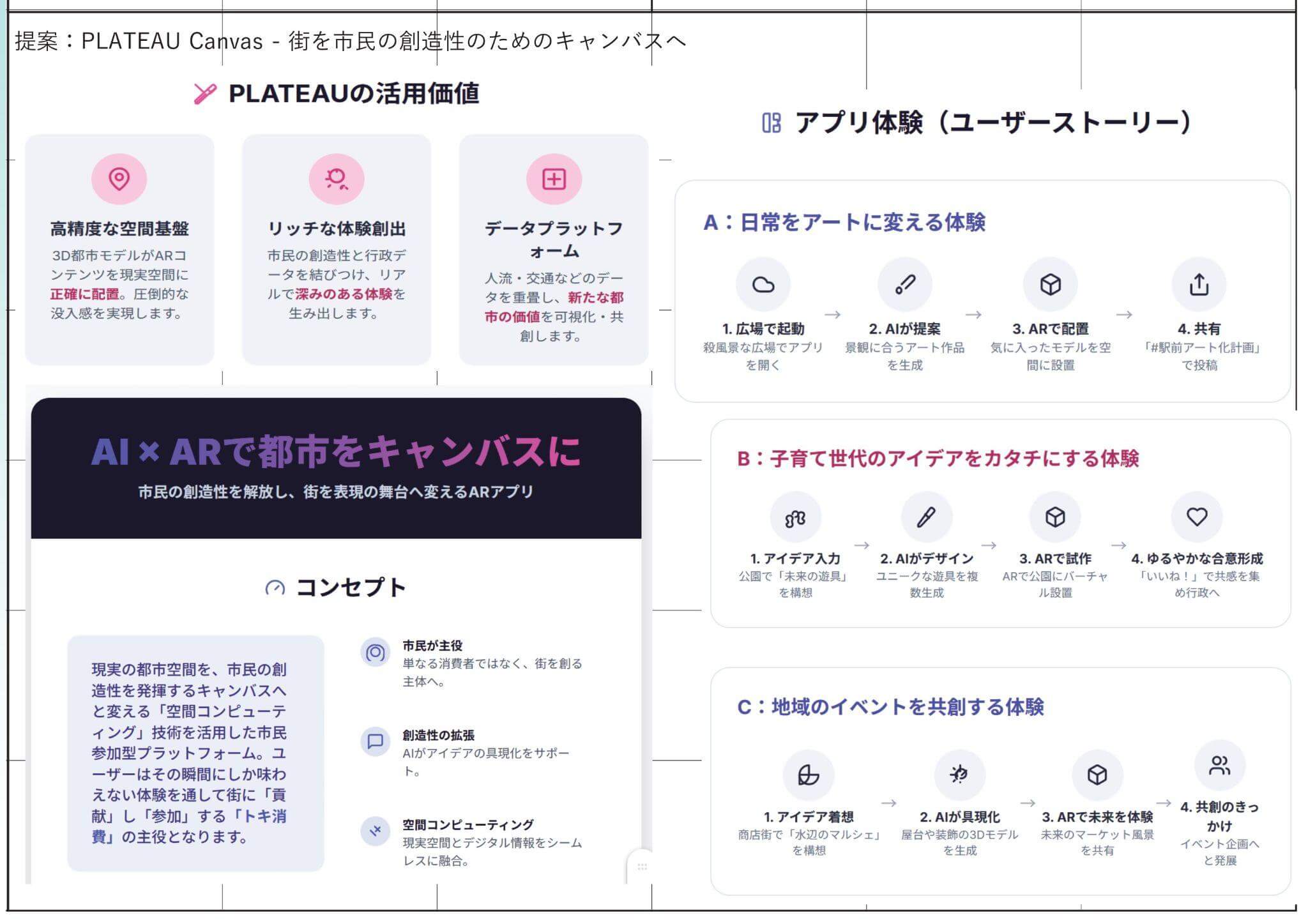 市民と行政間の「コミュニケーションの断絶」という社会課題に着目し、街を「市民の創造性を発揮するためのキャンバスへ変える」というアイデアを提唱。AR/VRアプリケーションを通じ、ユーザーはカメラで捉えた現実の風景にAIが生成した3Dモデルを配置し、理想の街並みを表現できる。