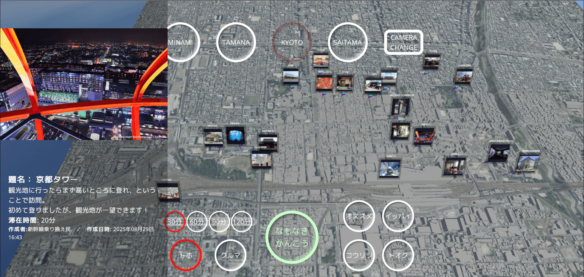 観光計画立案の手間を解消し、観光客が多様な場所を訪れる機会を創出することを目指したアプリケーションを発表した。コンセプトは「目的地でもない、計画もたててない、ちょっと空いた時間にまちに出よう」。電車や新幹線の待ち時間、仕事終わりの空き時間など、短時間で楽しめる観光コースを提案する。