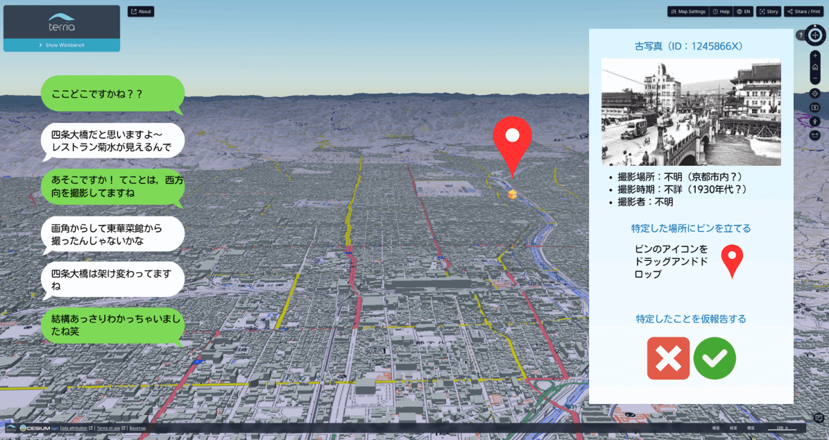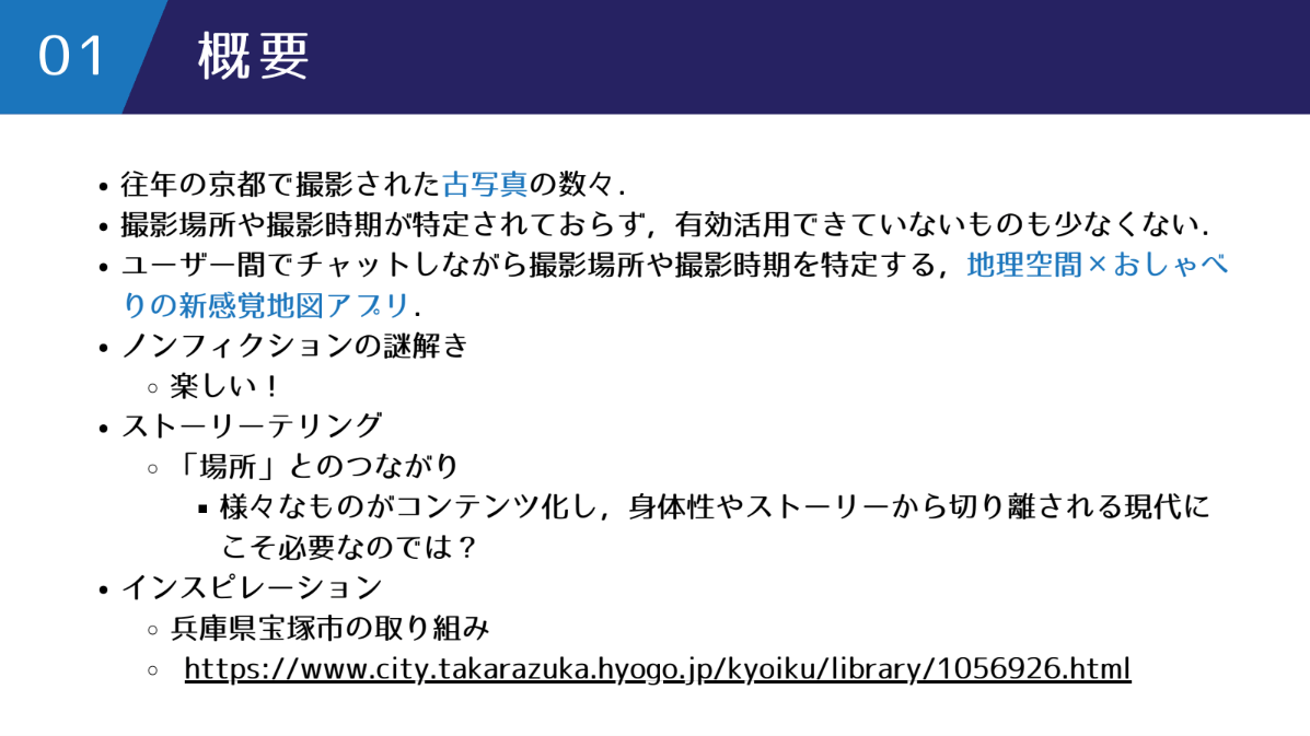 京都市に多数存在する撮影場所や撮影時期が不明な古い写真を有効活用するためのダッシュボードアプリを発表。ユーザーがチャットを通じて協力し、写真の撮影場所や時期を特定する「ノンフィクションの謎解き」体験を提供する。