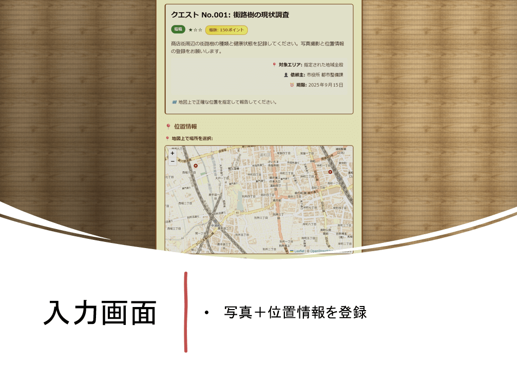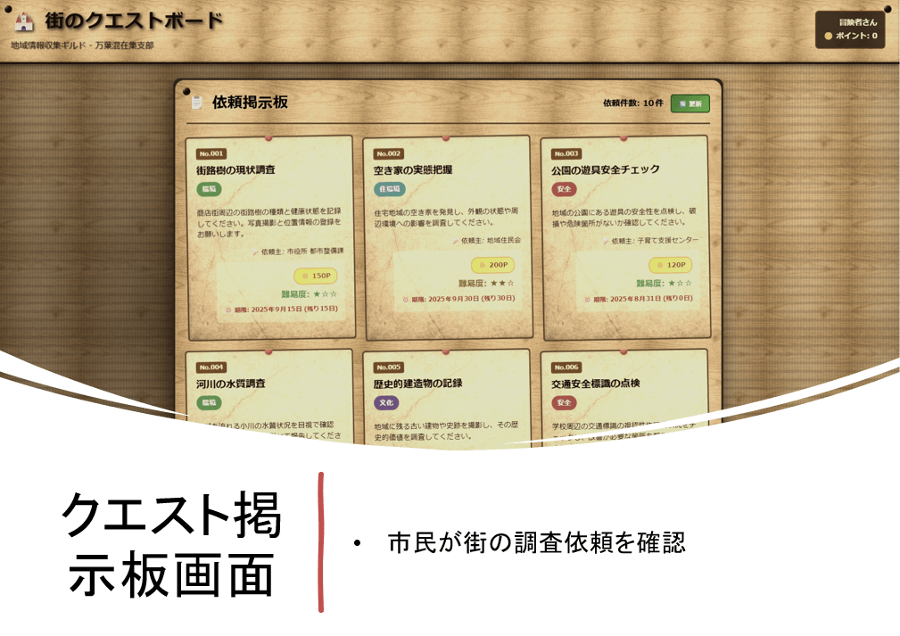 人手不足が深刻化する中で、自治体が抱える都市情報の収集・更新・メンテナンスにかかる課題を、市民参加型で解決を図るゲーミフィケーションシステム。アプリ内で「クエスト」としてデータ収集依頼(例:空き家調査、公園遊具の確認、街路樹の調査)が発行され、市民はそれに協力して情報を登録することでポイントを獲得。これにより、市民は楽しみながらまちづくりに貢献し、リアルタイムな災害マップなどへの活用も期待できるとのこと。