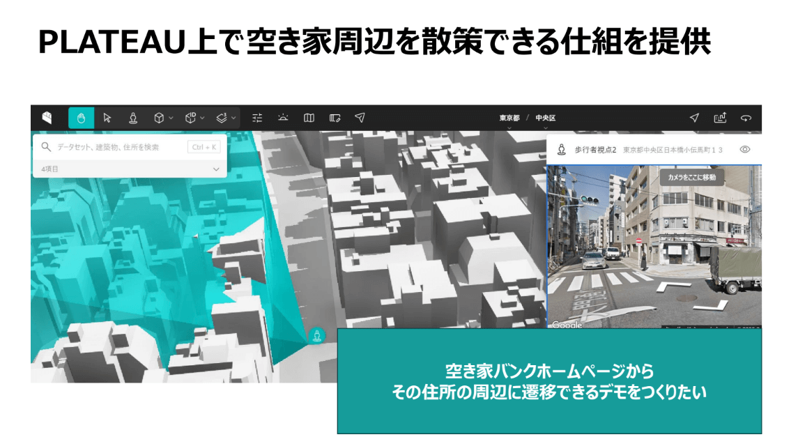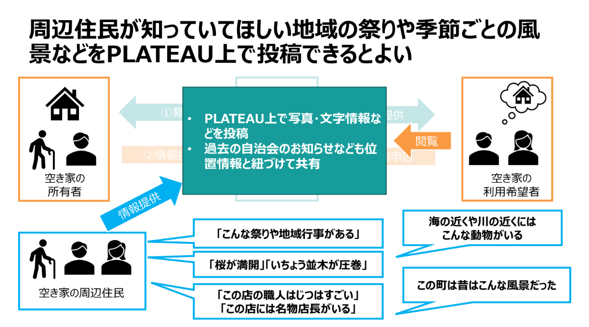 具体的には、地域の住民が、知っていてほしいと思う情報――例えば、周辺地域のお祭りや季節ごとの景観の移り変わり、自治会のお知らせなどを、空き家の利用希望者に向けて、PLATEAU上で写真や文字情報を位置情報とひもづけて投稿し共有しようというアイデアだ。