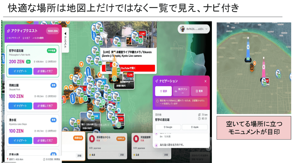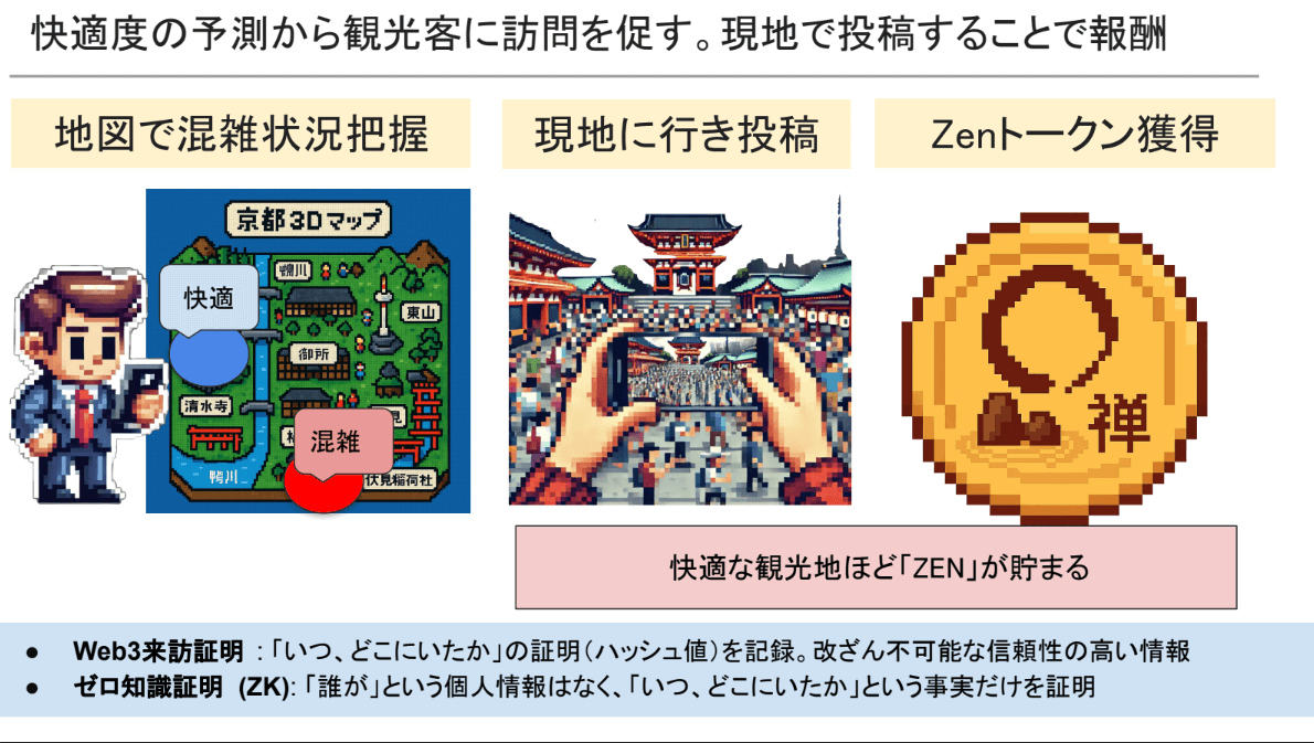 京都市におけるオーバーツーリズム問題、特に観光客が混雑状況を把握し、快適な観光ルートを選択できないというポイントに着目。このアプリでは、3Dマップでリアルタイムの混雑状況を可視化し、観光客を混雑していないエリアに分散させることを目指すとのこと。ライブカメラ映像、天気カメラ映像、オープンウェザーデータなどを地図上に表示し、混雑度と天候を組み合わせた「快適度」を提供。空いている場所への移動や情報投稿を促すためのインセンティブとして、個人情報を特定しない「トークン」を付与するレベリングシステムを構想している。