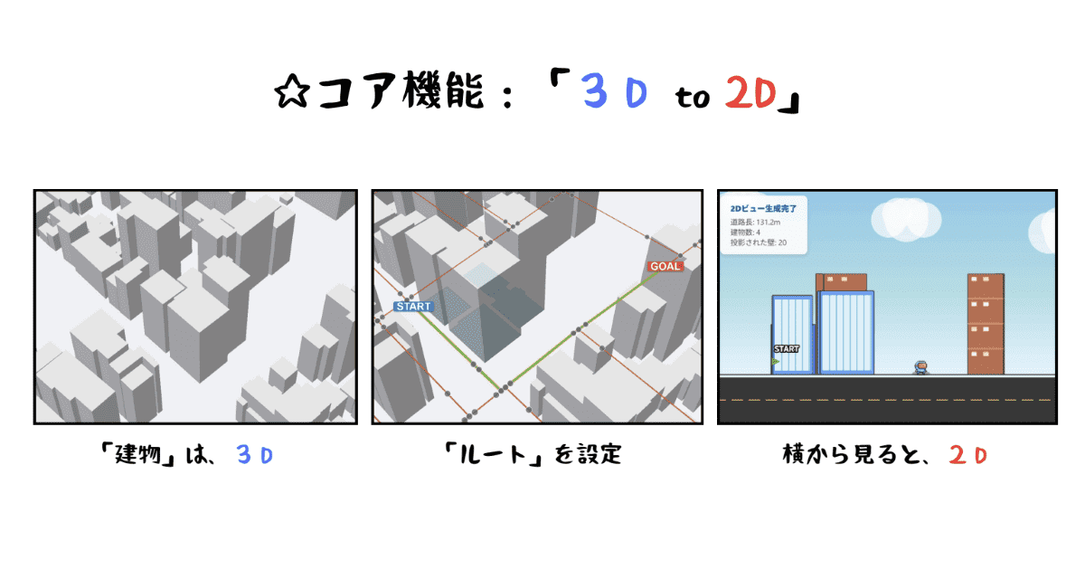 グランプリ、そしてオーディエンス賞をダブル受賞したのは、さんま豊漁ズの「PLATEAU-2D」だ。端的に言うと、3Dの都市モデルを「横から見た2D断面図」に変換するツールである。3Dマップから選択したルート間を2Dモデルで表示する。