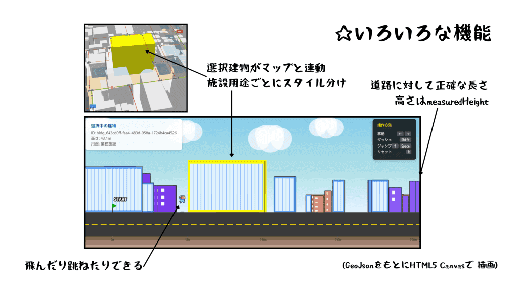 上部の3D都市モデルでスタート地点とゴール地点を設定すると、2D画面でキャラクターの前に該当ルートの建物が表示される。ルート上の建物は属性情報を取得しており、施設用途ごとにスタイル分けして表現されている。