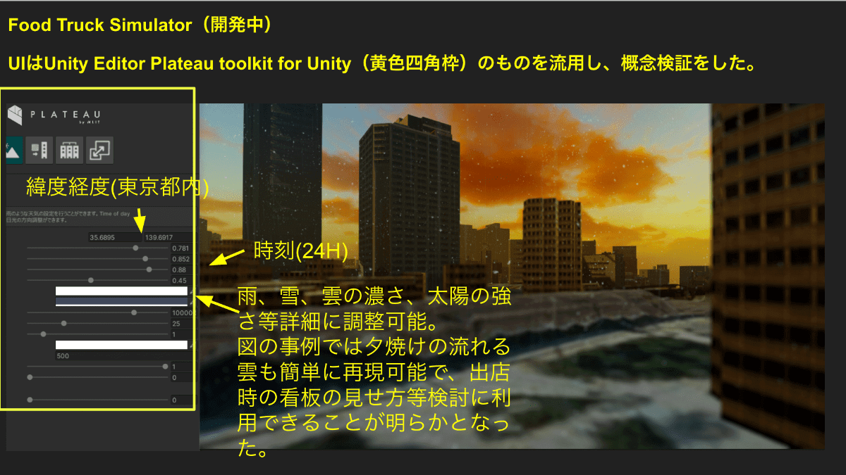 「Food Truck Simulator」は、フードトラックの出店場所を3D都市モデル上でシミュレーションするツール。フードトラックは出店場所や時間帯、配置といった条件で売上が大きく変動するが、その売上予測や労働環境の検討を支援するものだ。PLATEAU SDK for Unityで天候や時間帯による日照条件の変化を再現することで、これらの条件検討を容易にできるのではないかと考えた。まだ開発中ということで、今回の発表では、その検証結果を報告した。
