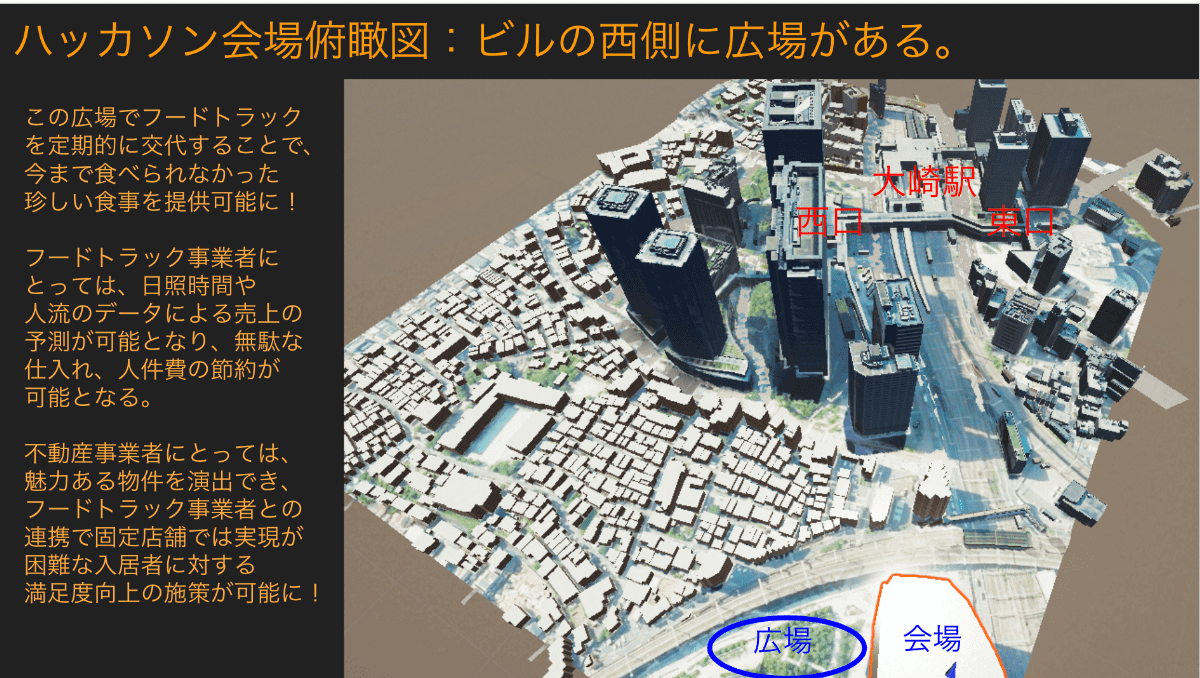 ハッカソン会場周辺の東京都品川区の大崎駅周辺の出店状況をシミュレートした。大崎駅エリアではビル隣の広場にフードトラックを出店することで、ビル内の勤務者をターゲットとしたランチ需要を見込めるのではないかと結論付けた。