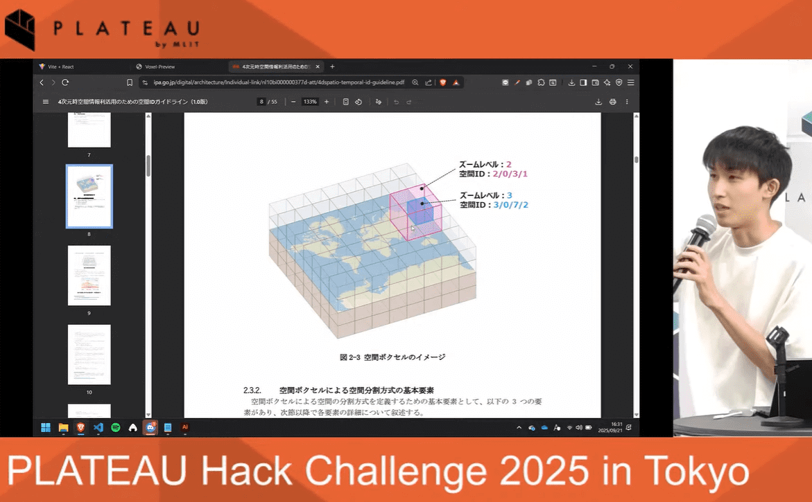 PLATEAUの3D都市モデルを使って、まだ見ぬ可能性を引き出す―国土交通省が主催する開発イベント「PLATEAU Hack Challenge 2025 in Tokyo」が9月20-21日、TONNEL TOKYOにて開催された。チームビルディングからアイデア出し、実装まで2日間で作成するハッカソンだ。参加者は9チームに分かれ、成果発表会では9作品がプレゼンされた。