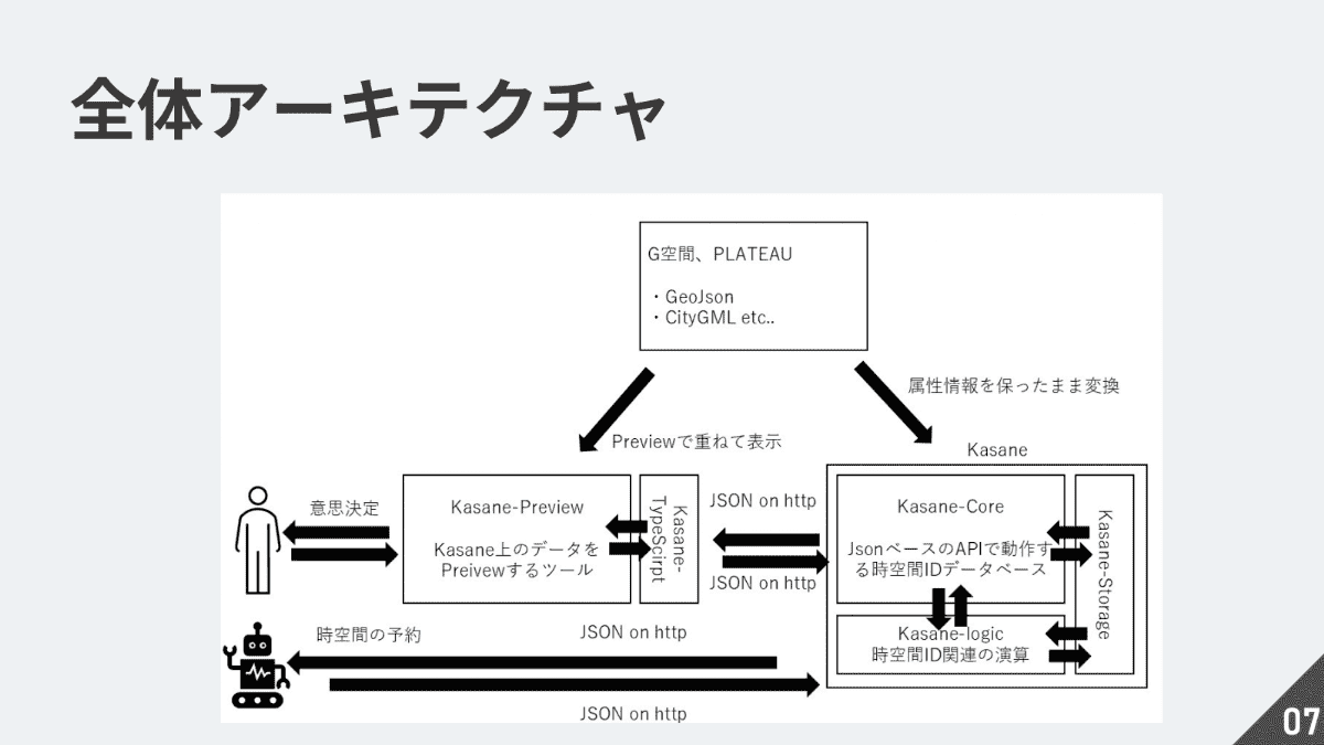 PLATEAU等のデータを属性情報を保ったままバックエンドで空間IDに変換・保存し、API経由で提供するという仕組みを構築。ユースケースとして想定するのはドローンやモビリティでの利用だ。例えば、「雨が降っている」「下に横断歩道があるため落下リスクが高い」といった情報を空間IDに与え、フィルタリングすることで、安全に飛行できる経路だけを抽出するというような使い方だ。将来的には、人間がプレビューを見て意思決定を行ったり、ロボットやモビリティが自律的に空間を予約したりする世界の実現を目指すという。