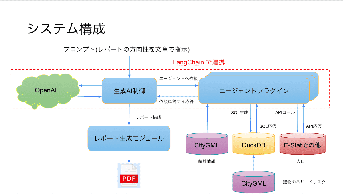 ユーザーが対象地域を指定すると、AIがPLATEAUの3D都市モデル(CityGML)から客観的なデータを抽出し、自然な文章と組み合わせて分析レポート(PDF形式)を自動で生成する。システムの中心となるのはOpenAIのAPIを制御し、ユーザーからの指示を受け付ける「生成AI制御」部分、そしてPLATEAUのデータから客観的な統計データを抽出する「エージェント」だ。PLATEAUのデータは膨大なため、LLMのAPIに直接すべてを渡すことはできない。そこで、統計情報だけを事前に集計したり、データを一度データベース(DuckDB)に格納し、AIにSQLを生成させて必要な情報だけを絞り込んだりといった工夫をしている。
