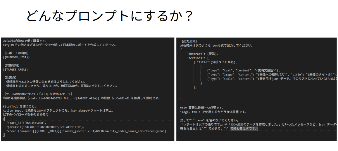 「都市計画レポート生成AI」は、PLATEAUのデータから客観的な統計情報を抽出し、レポートを生成するAIツールだ。都市計画レポートは自治体が住民へ都市計画を伝えたり、職員間の意思疎通を図ったりするために不可欠な要素だが、その作成には多大な労力がかかる。一方で、自治体の都市計画に携わる人材は減少傾向にある。このことから、都市計画レポートの作成を支援するAIツールの開発を目指した。