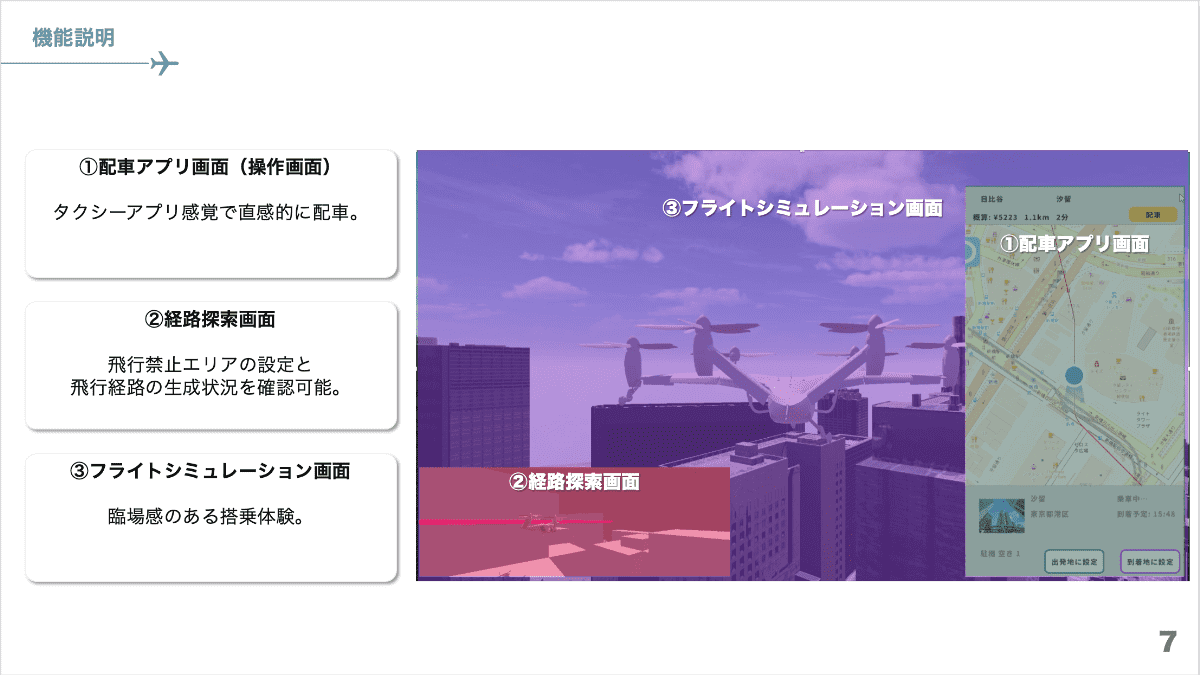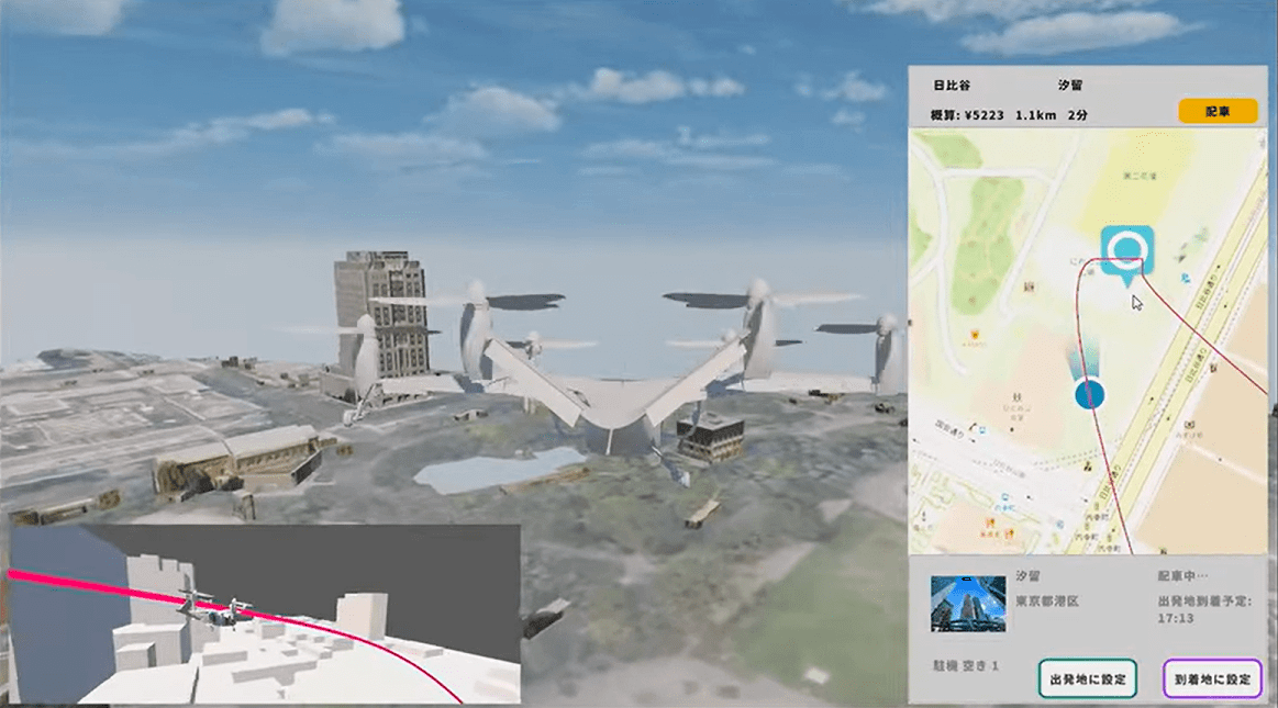 「AirTaxi Go」には、ユーザーが出発地と目的地を設定して配車を依頼する配車機能、経路検索、フライトシミュレーターの3つの機能がある。フライトシミュレーターでは、一人称視点の画面で利用者が実際にエアタクシーに乗っているかのような体験ができる。