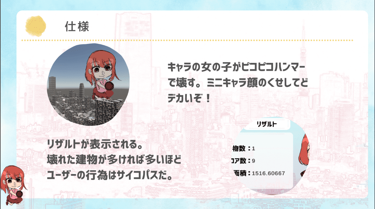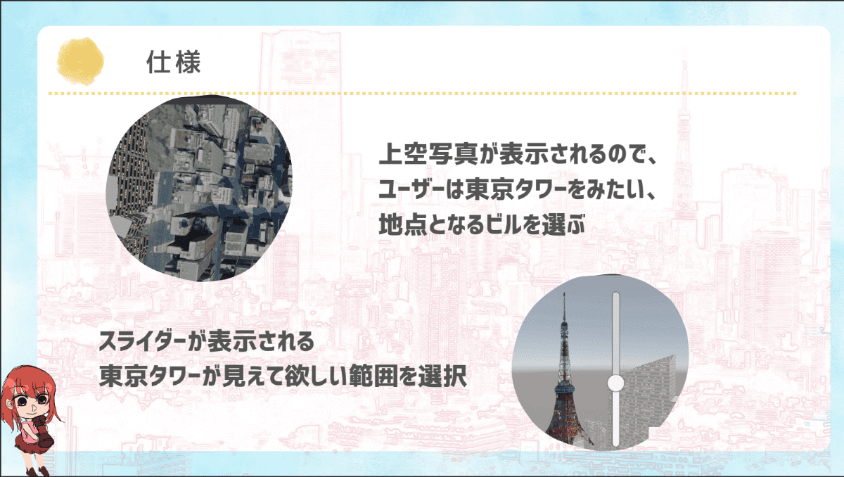 ユーザーはマップ上で東京タワーを見たい地点(ビルや窓)を選択し、スライダーで「タワーのどの部分までを見たいか」を指定する。スタートすると、デフォルメされたキャラクターがピコピコハンマーで邪魔な建物を破壊していき、視界を確保する。最後には、壊した建物やフロアの数、面積などが集計され、表示される。