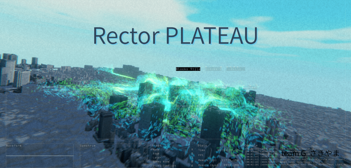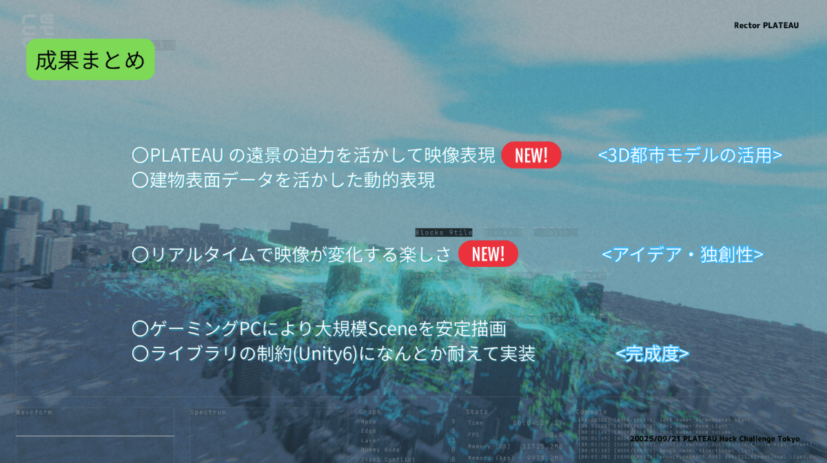 Unity6を中心に、PLATEAU SDK for Unity、Blener等を使って制作した。こだわった部分として、PLATEAUの3D都市モデルのデータをSDF(符号付き距離関数)形式に変換し、UnityのVFX Graphと組み合わせた点を挙げた。