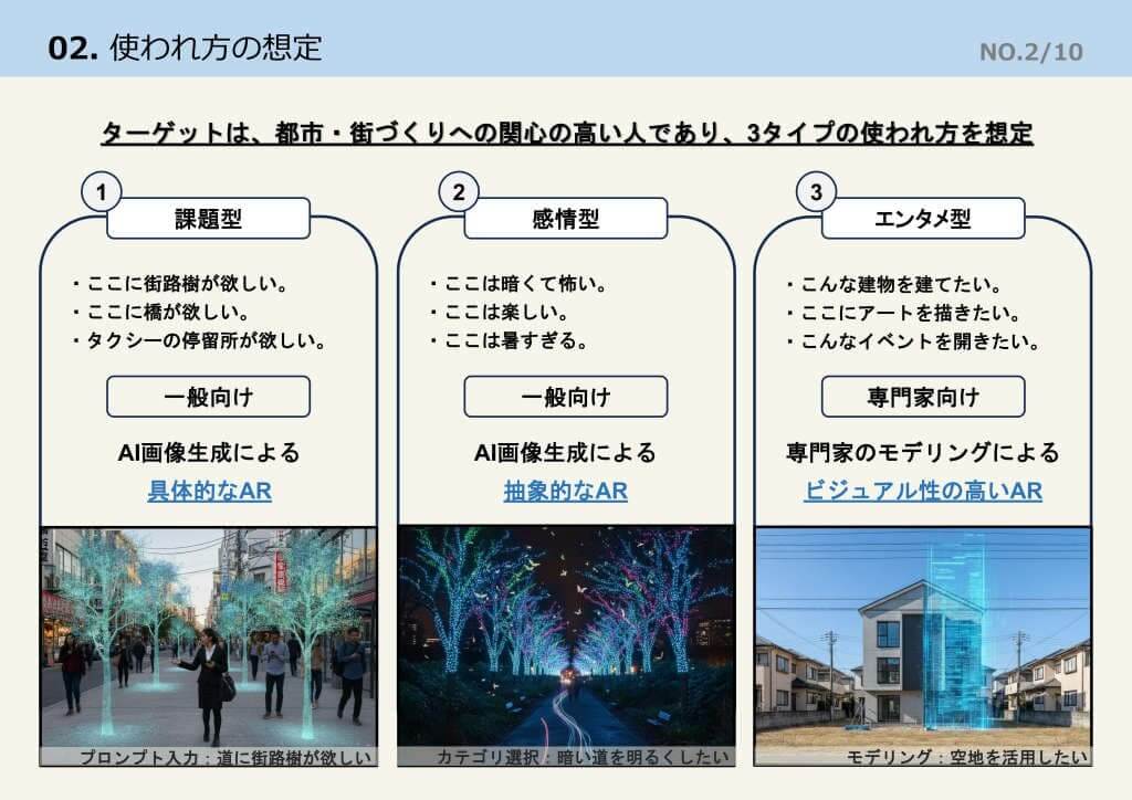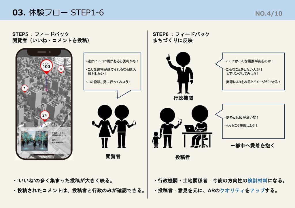 ユーザーはまず、現地でARモードを起動しプロンプト等を通じて3Dモデルを生成し、現実空間に重ね合わせて投稿する。他のユーザーはその投稿に対して「いいね」やコメントといった形でフィードバックを送ることができる。行政機関・土地関係者は、そのコメントをまちづくりや今後の土地利用の検討材料にできる。こうした一連の流れから、まちづくりへの住民参加や地元への愛着醸成、住民の意見収集など、まちづくりに関するゆるやかな合意形成が可能になるとする。