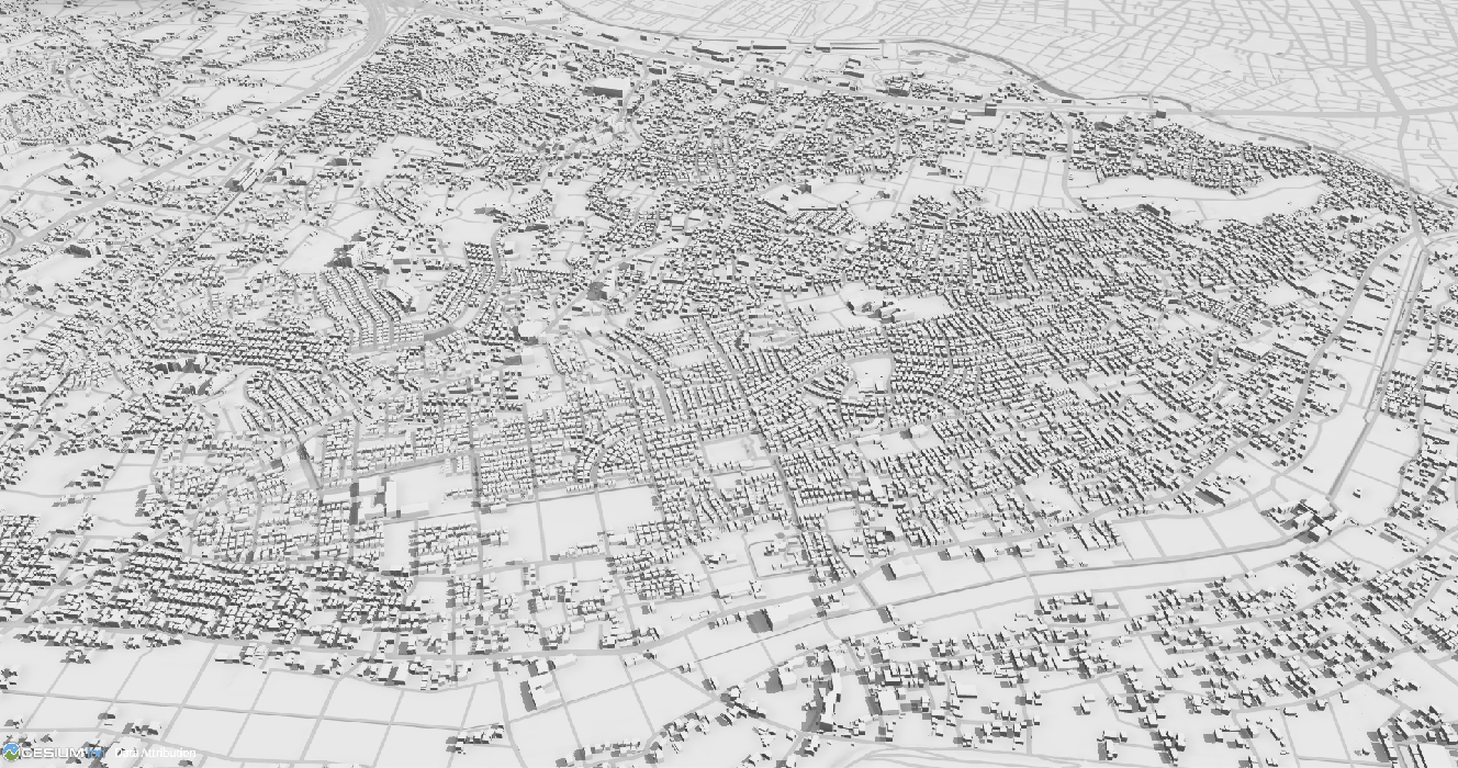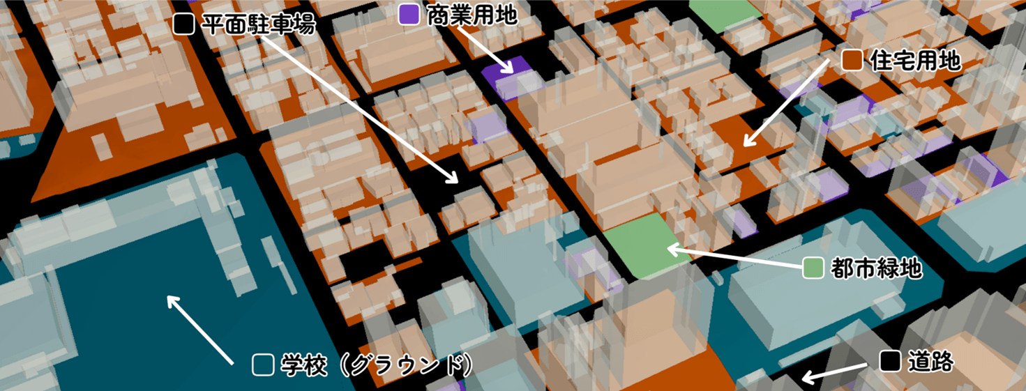 本プロジェクトでは、3D都市モデル(建築物LOD1、道路LOD1、土地利用LOD0)および下水道の集水範囲に基づき、都市域における舗装面・植生面等の土地被覆種別を判別するとともに、1mメッシュ相当の解像度を有する高精細DEMデータから得られる地表面標高情報と統合することで、内水氾濫解析アルゴリズムを構築する。