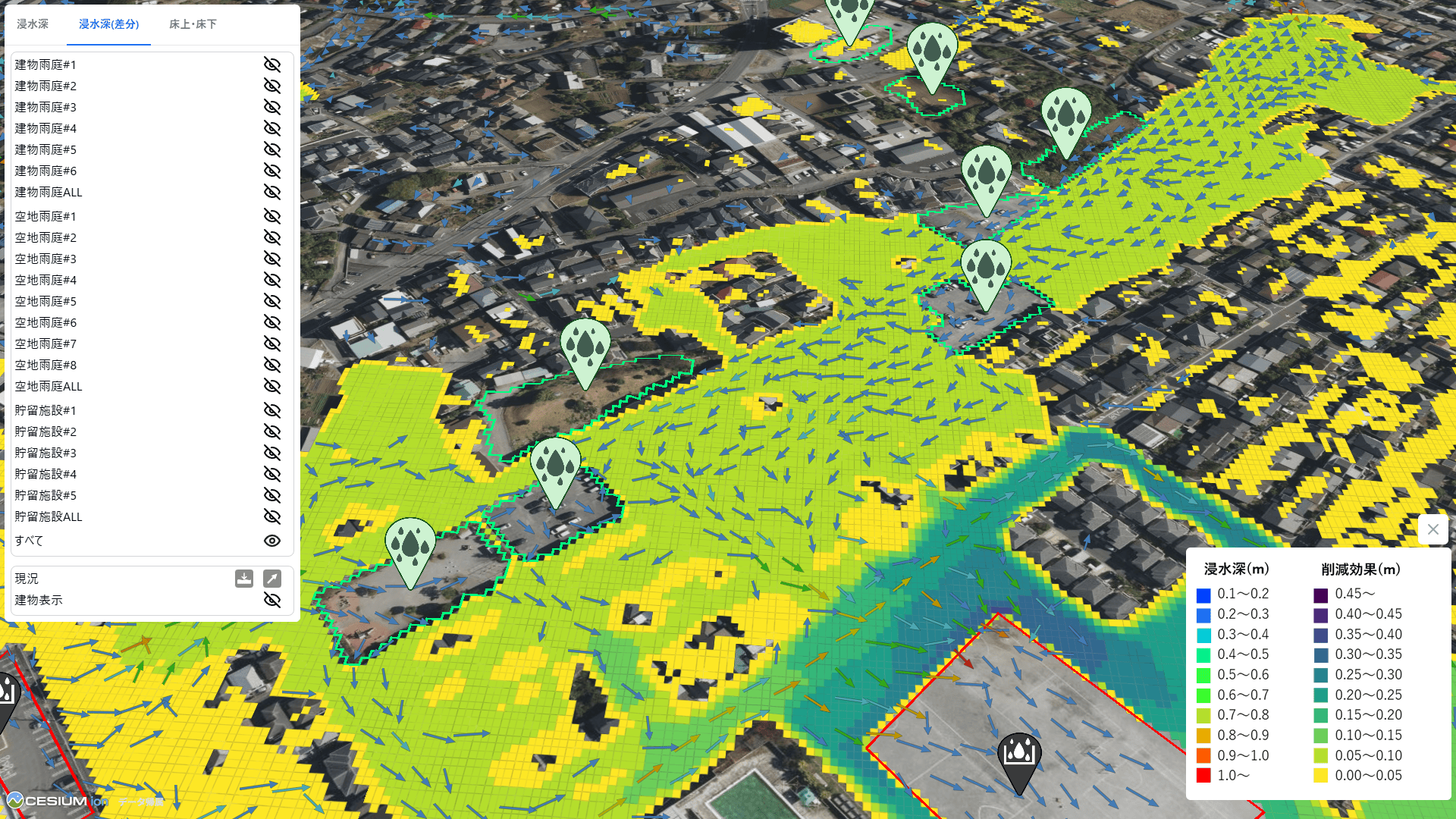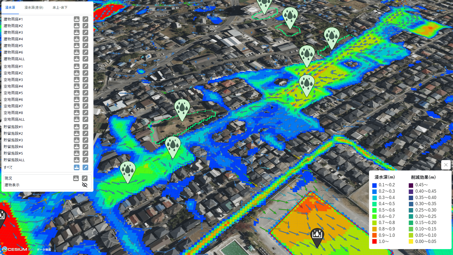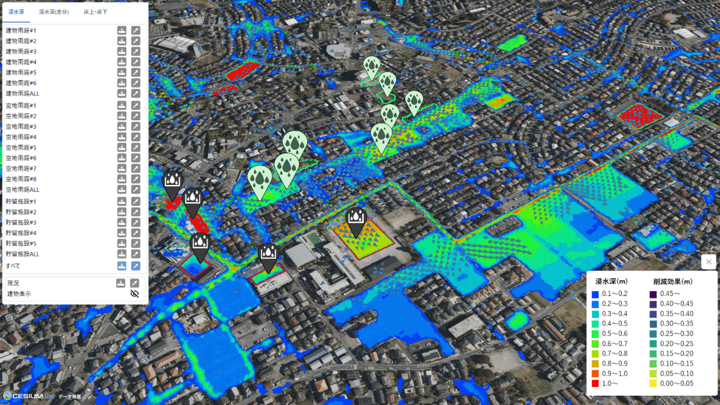 得られたシミュレーション結果は、3D都市モデル上で直感的な把握を可能にするWebGISシステムとして可視化される。内水氾濫リスクの分布や雨庭による流出抑制効果を3D都市モデル上にカラーマップとして直接投影することで、専門知識の有無にかかわらず対策効果を視覚的に体感することを可能とした。