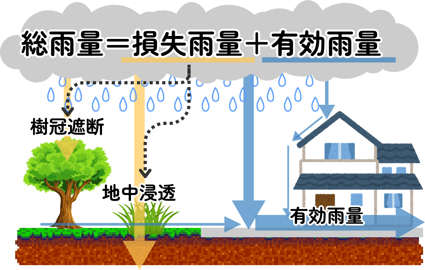 1.戸建住宅の庭先等に設置される「建物雨庭」については、屋根に降った雨水が雨どい等を通じて地中へ浸透する仕組みを想定し、対象となる建物メッシュに対して雨庭効果を考慮して低減した有効雨量を与えることで表現した。